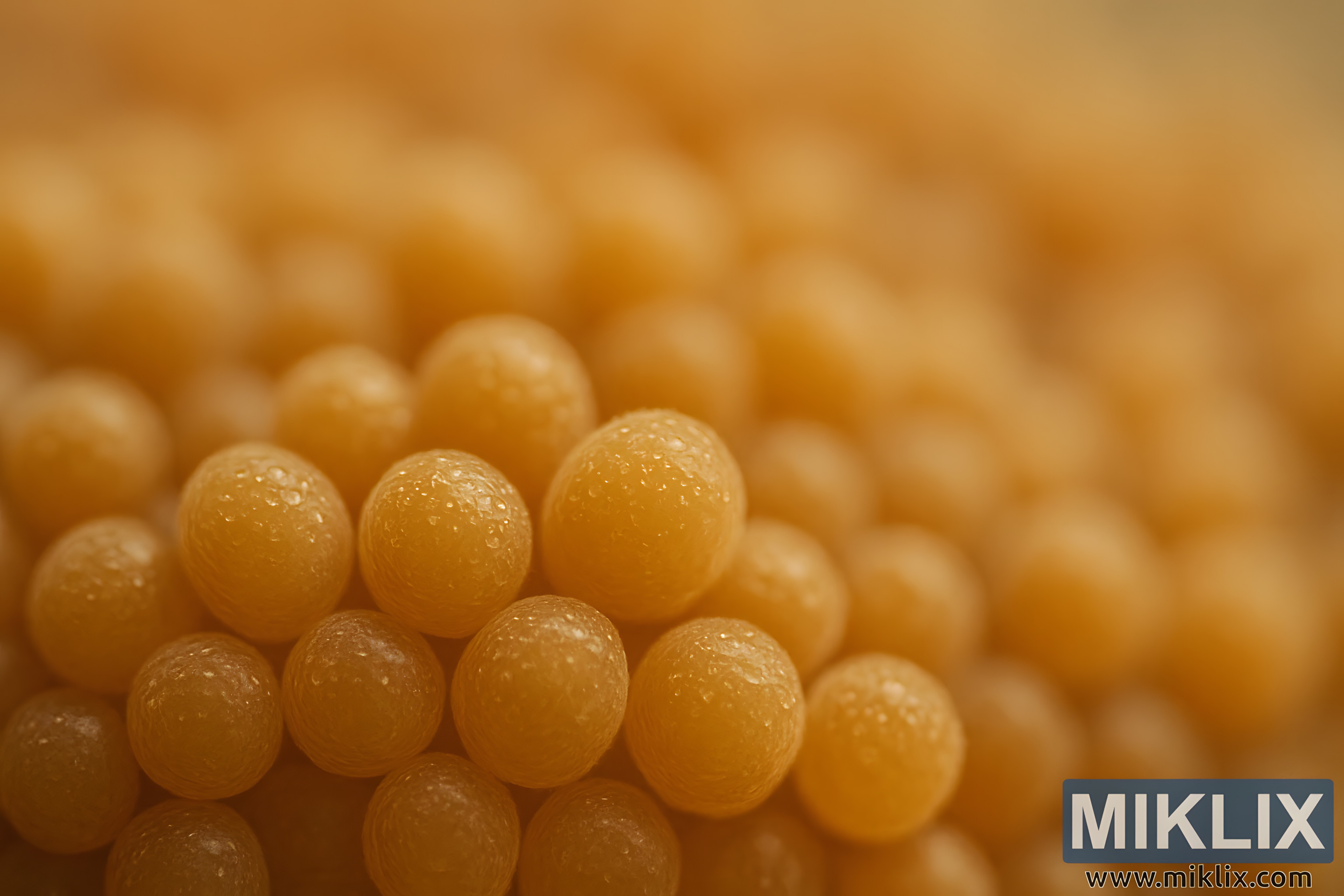 Detaljan krupni plan vlažnih, aktivnih stanica kvasca, koji ističe njihovu teksturu i važnost u fermentaciji piva.