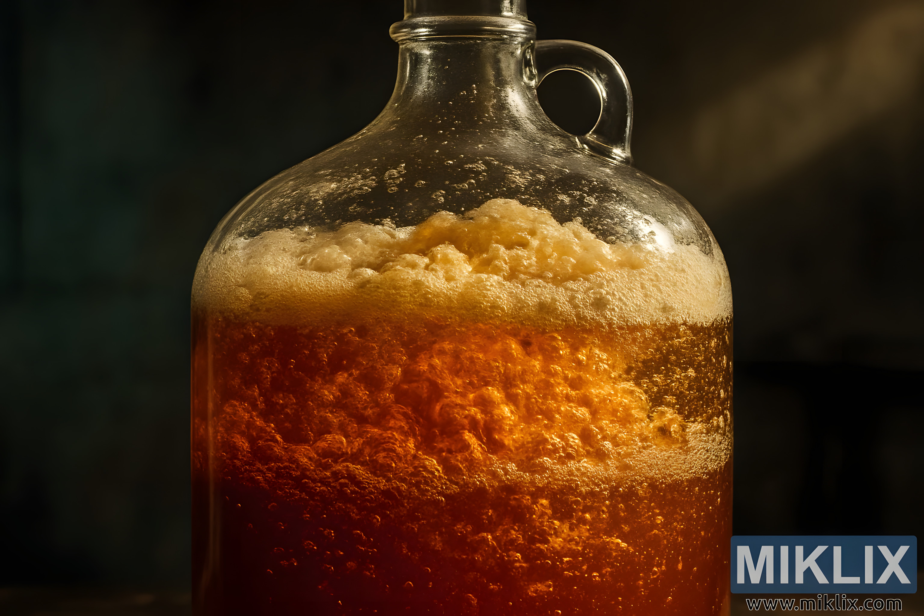 Dinamičan krupni plan jantarne tekućine koja fermentira u staklenoj posudi, s mjehurićima koji se dižu i dramatičnim bočnim osvjetljenjem koje naglašava proces.