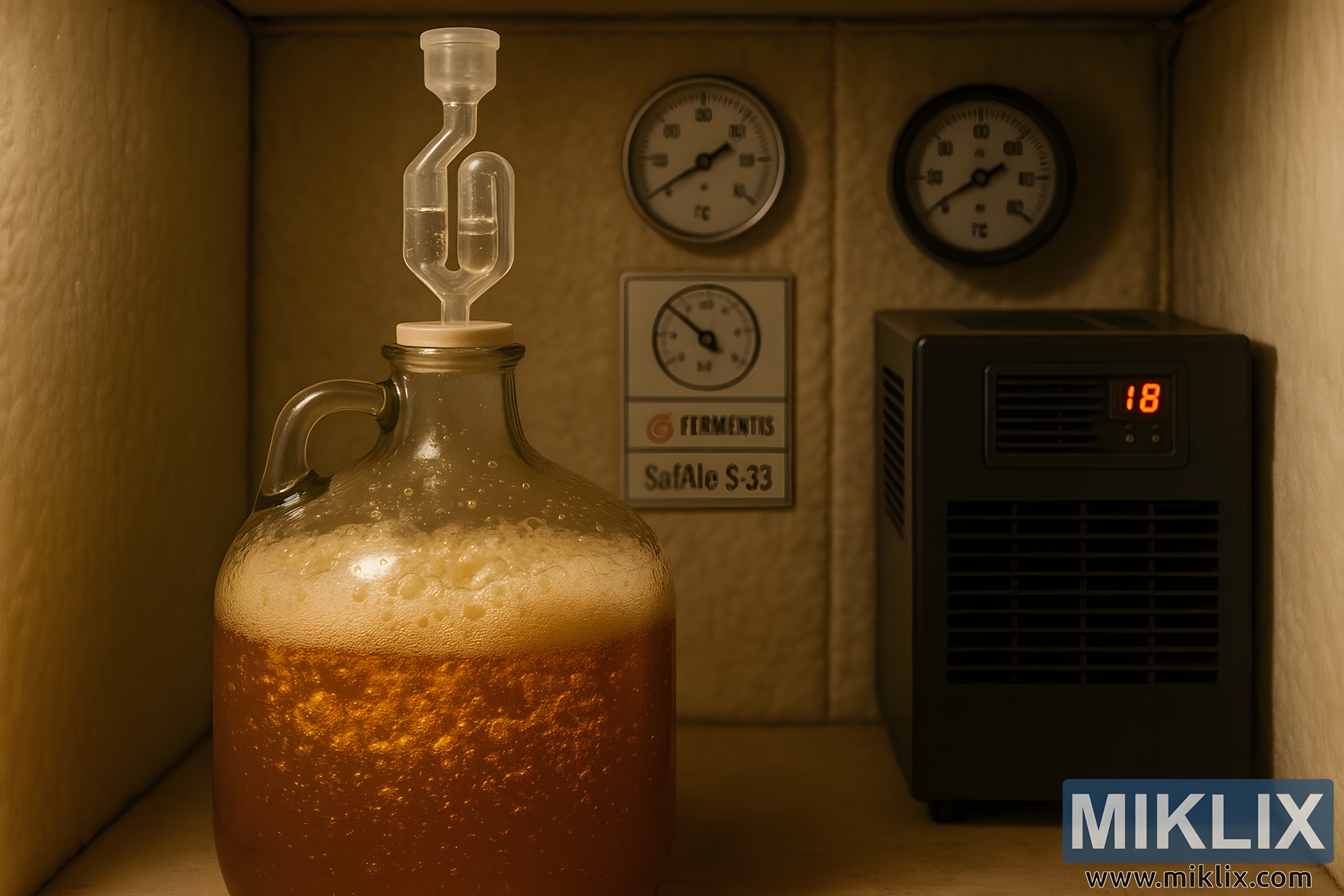 Sama demižon klasičan je simbol kućnog pivarstva i fermentacije u malim serijama, a njegove prozirne stijenke nude uvid u biološku transformaciju koja se odvija unutra. Vrtložna tekućina, bogata bojom i kretanjem, odražava metaboličku aktivnost kvasca - posebno soja SafAle S-33, što pokazuje znak postavljen na stražnjoj stijenci. Poznat po svom robusnom profilu fermentacije i sposobnosti proizvodnje voćnih estera i suptilnih nota začina, S-33 uspijeva u kontroliranim okruženjima poput ovog, gdje se temperatura i tlak pedantno održavaju kako bi se optimizirale performanse.