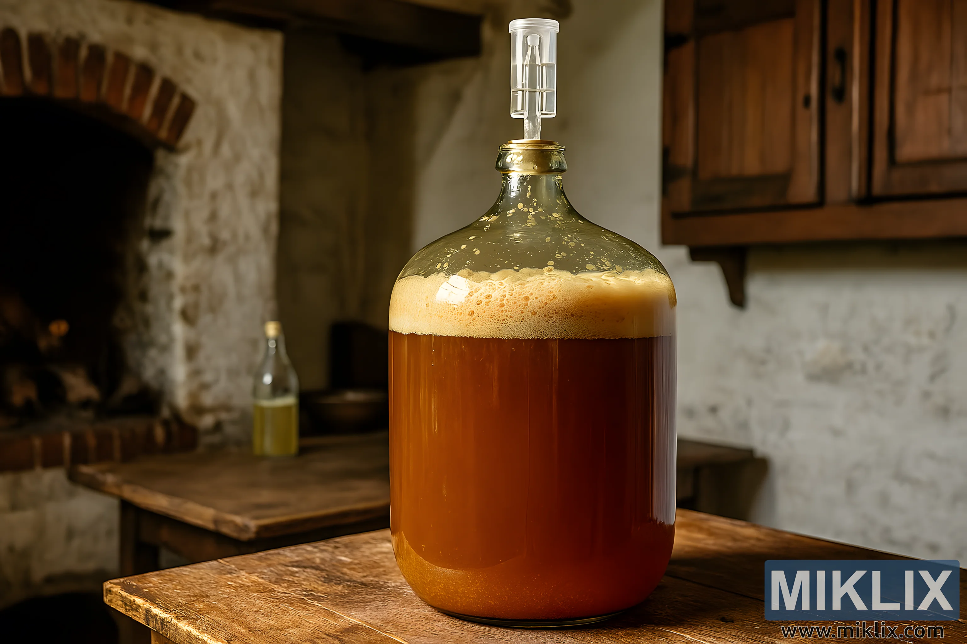 Dodatni elementi kuhanja piva obogaćuju scenu: staklena boca uskog grla napunjena blijedom tekućinom stoji lijevo od demižona, a iza nje plitka zemljana zdjela, nagovještavajući alate i sastojke korištene u procesu kuhanja piva. Prirodno svjetlo prodire s lijeve strane, bacajući meke sjene i osvjetljavajući teksture stakla, drva i žbuke. Kompozicija je pažljivo uravnotežena, s demižonom malo izvan centra udesno, što omogućuje gledatelju da upije okolni okoliš, a istovremeno pivo koje fermentira ostaje središnja točka.