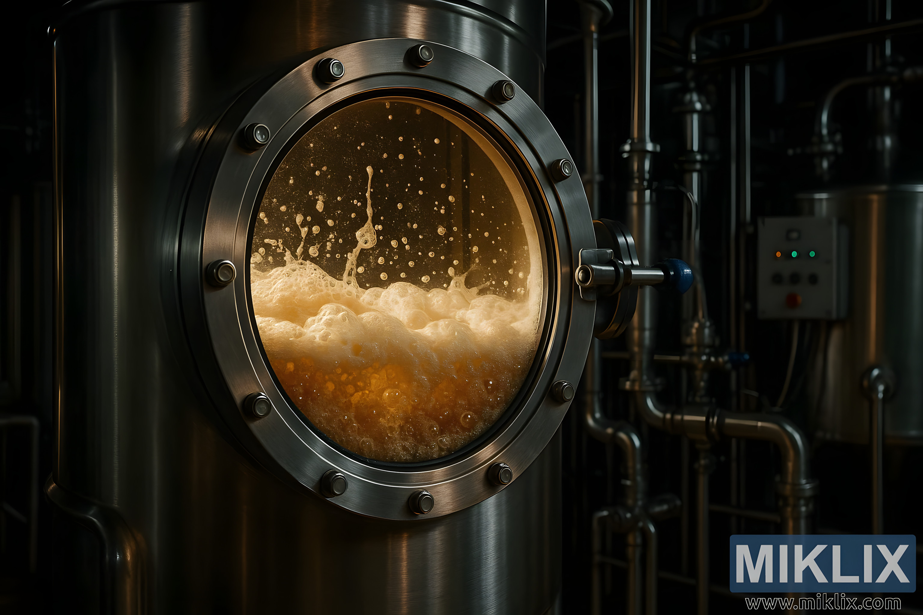 Spremnik za fermentaciju od nehrđajućeg čelika s vidljivim mjehurićima i pjenom, naglašava preciznost kuhanja craft piva.