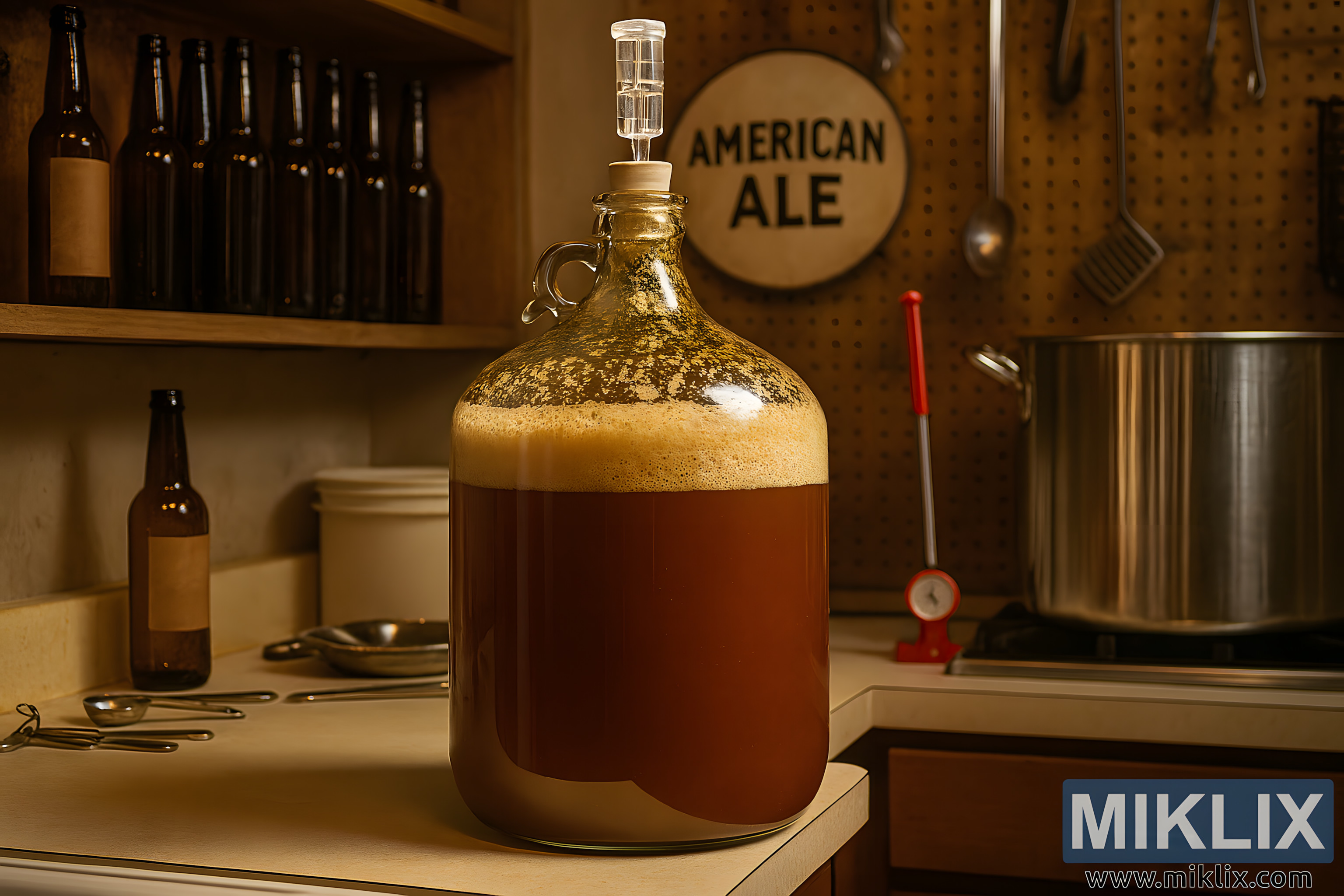 Lijeve strane, drvena polica postavljena na zidu drži red pivskih boca od jantarnog stakla, neke s etiketama, a druge prazne. Ispod police, kremasta radna površina sadrži osnovne alate za kuhanje piva: set mjernih žlica od nehrđajućeg čelika na prstenu, metalni otvarač za boce i djelomično vidljivu bijelu plastičnu kantu za fermentaciju spremljenu iza demižona.