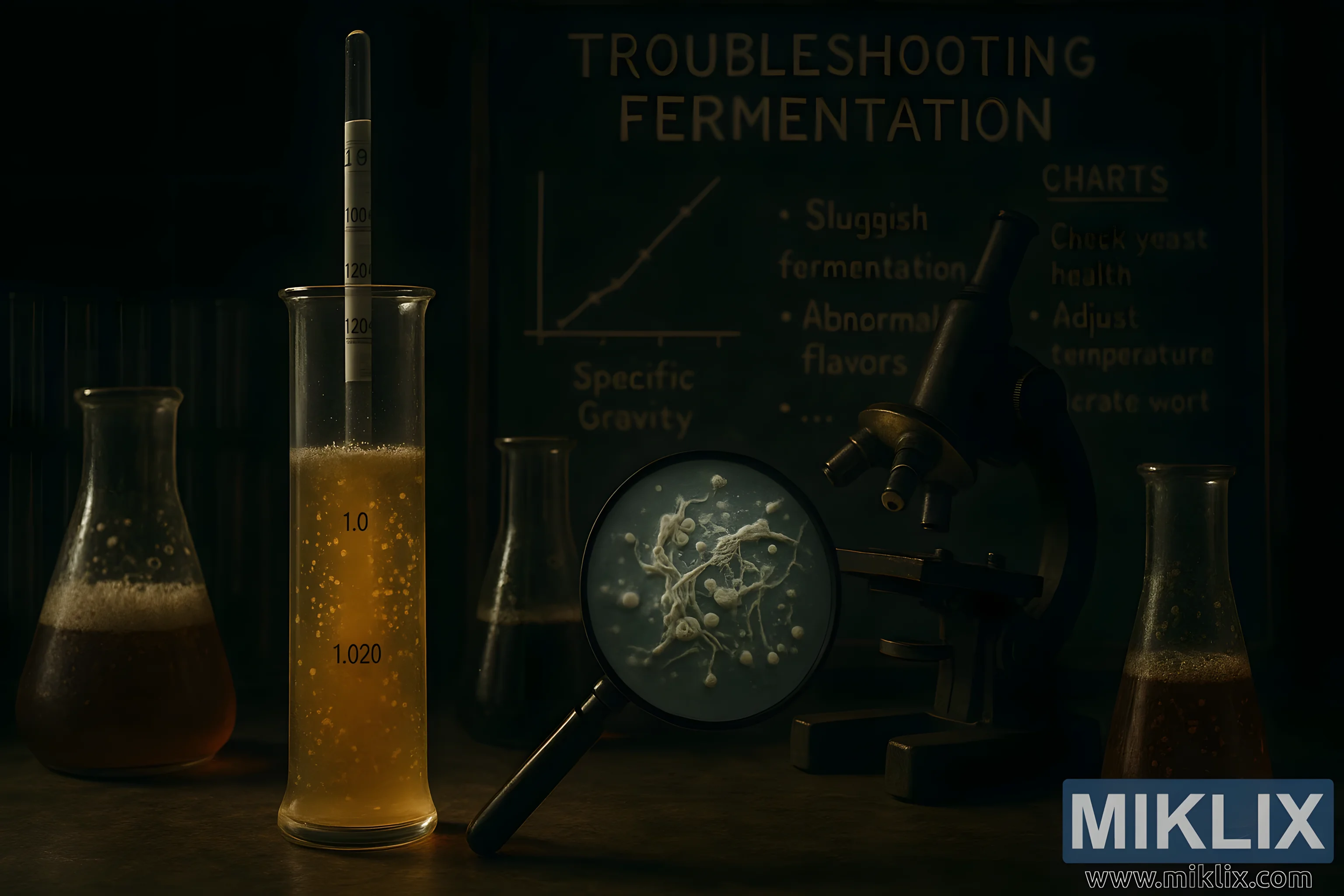 Mračni laboratorij s hidrometrom, mikroskopom i stresnim stanicama kvasca, ističući izazove u rješavanju zastoja u fermentaciji.