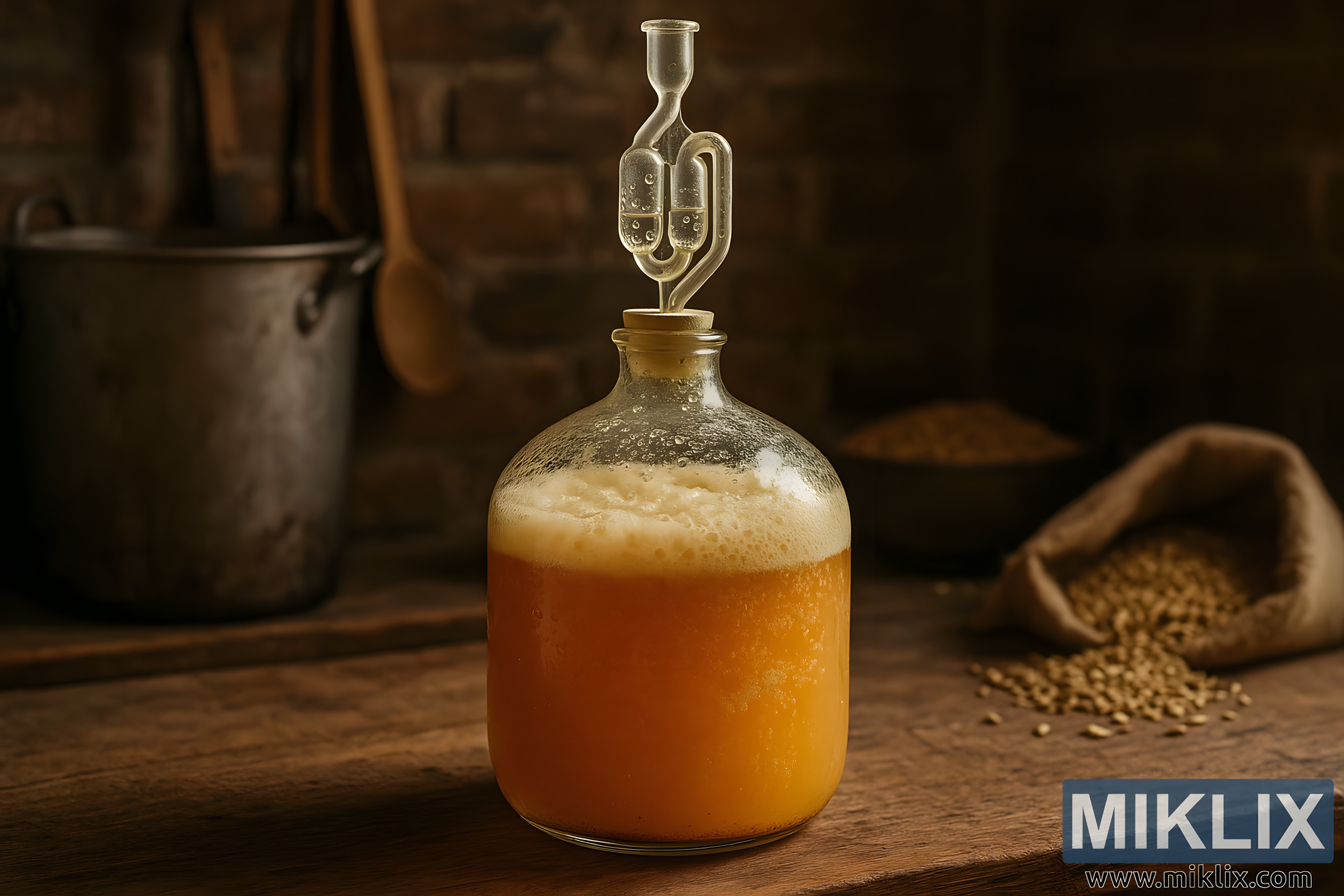 Slika prikazuje rustikalnu scenu kućnog pivarstva usredotočenu na prozirnu staklenu posudu za fermentaciju, poznatu kao demižon, u kojoj aktivno fermentira serija kiselog piva. Sam demižon je zdepast i lukovičast, sa širokim tijelom koje se blago sužava u kratki vrat. Na vrhu vrata nalazi se čvrsti gumeni čep s prozirnom zračnom komorom u obliku slova S. Sitni mjehurići prianjaju uz unutarnje stijenke zračne komore, a još nekoliko se može vidjeti kako se dižu kroz vodu unutar nje, što ukazuje na to da je fermentacija u tijeku i da se ugljikov dioksid stalno oslobađa.