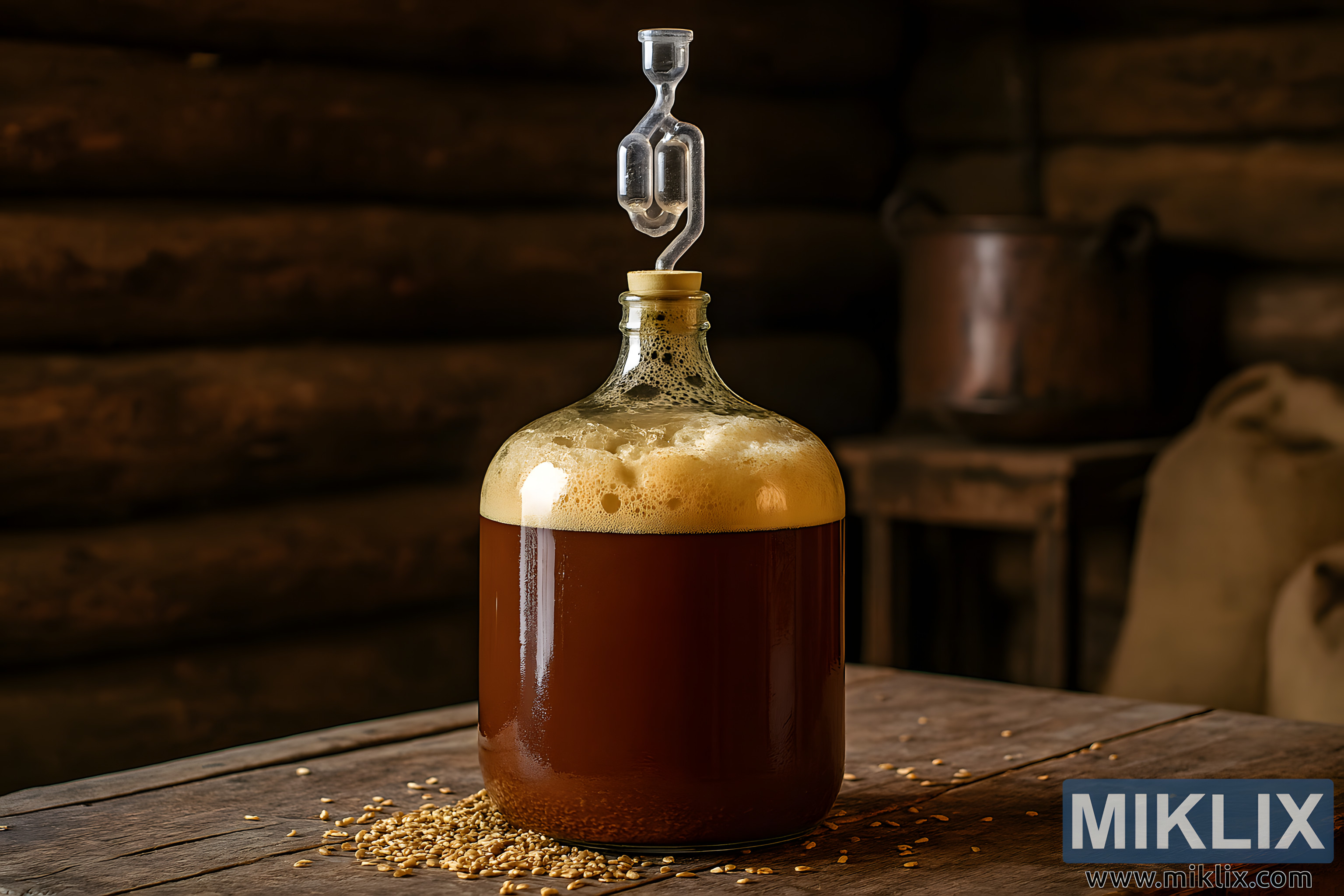 Fotografija krajolika visoke rezolucije prikazuje fermentaciju tradicionalnog belgijskog opatijskog piva u rustikalnom okruženju domaćeg pivarstva. Središnji fokus je velika staklena demižona, napunjena bogatim jantarnim pivom koje aktivno fermentira. Demižona je cilindričnog oblika sa zaobljenim dnom i uskim grlom, prekrivena bijelim gumenim čepom i prozirnom zračnom komorom u obliku serpentine napunjenom vodom. Zračna komora vidljivo mjehuri, što ukazuje na aktivnu fermentaciju. Debeli sloj krausena - pjenaste pjene sastavljene od kvasca i proteina - kruni pivo, s mjehurićima različitih veličina i tekstura koji stvaraju dinamičnu površinu.