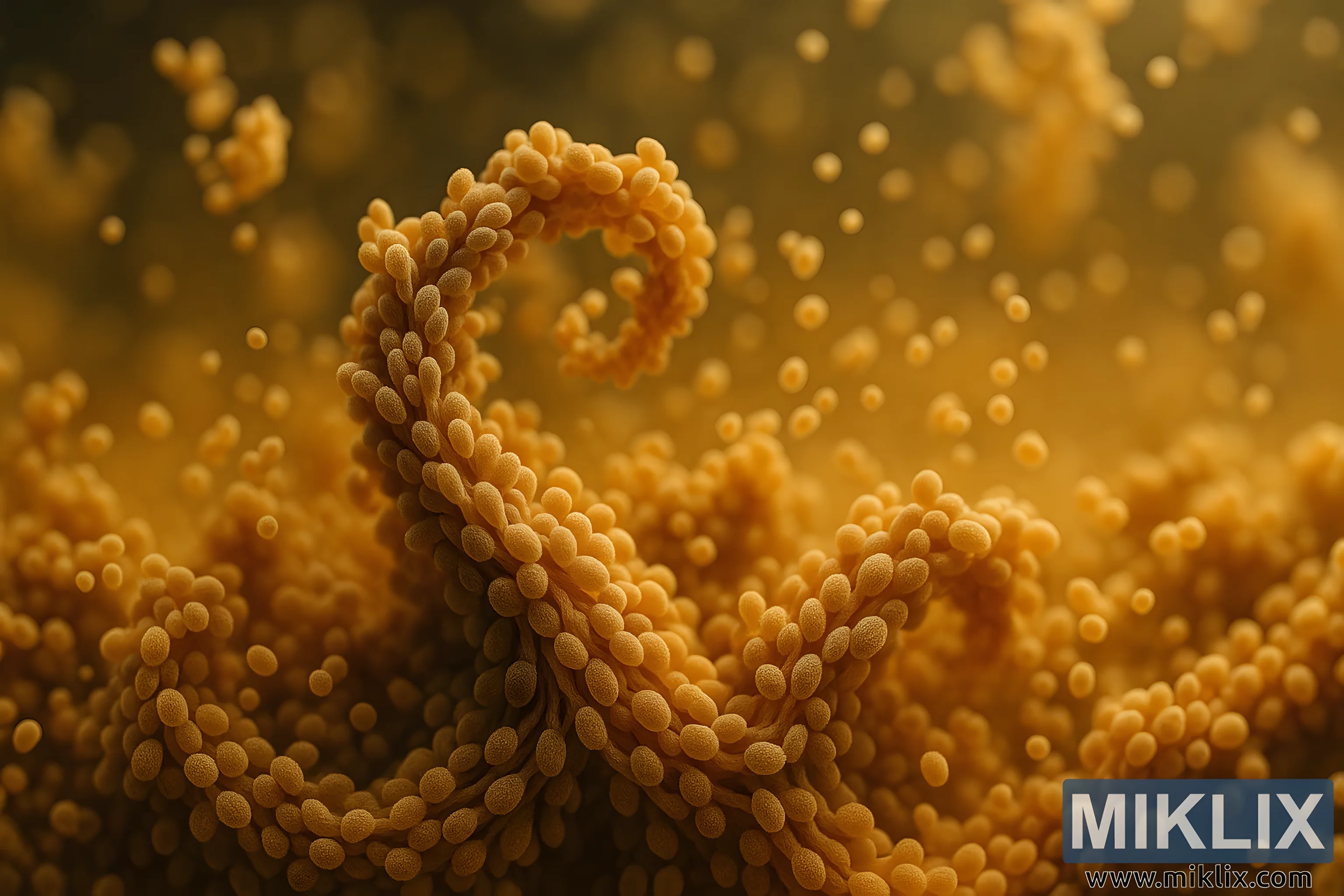 Prednji plan je studija teksture i složenosti. Stanice kvasca izgledaju punašne i poluprozirne, njihove površine su udubljene i sjajne kao da su prekrivene tankim slojem vlage. Topli, jantarni tonovi slike daju osjećaj vitalnosti i bogatstva, odražavajući zlatne nijanse piva koje pomažu u stvaranju. Ove stanice nisu izolirane - one su isprepletene, tvoreći nježne lance i nakupine koji sugeriraju i koheziju i kretanje. Makro objektiv korišten za snimanje ove scene otkriva fine detalje njihove strukture: suptilne grebene, preklapajuće membrane i slabašan odsjaj biološke aktivnosti. To je portret mikrobnog života u njegovom najljepšem izdanju, gdje se funkcija i oblik stapaju u vizualnoj simfoniji.