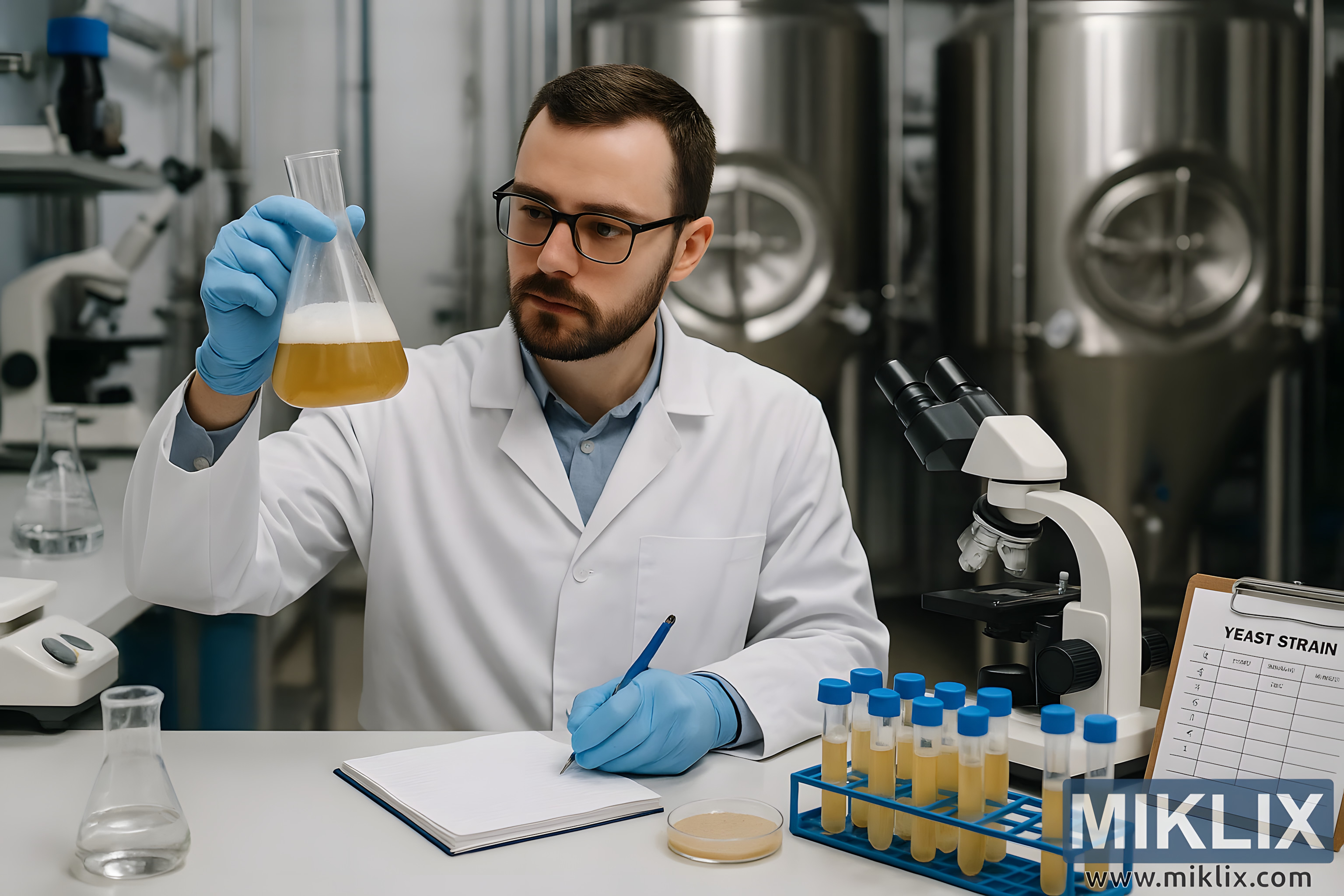 Znanstvenik u čistom laboratoriju pivovare proučava kulturu zlatnog kvasca u tikvici dok bilježi zapažanja, okružen laboratorijskim alatima i opremom.