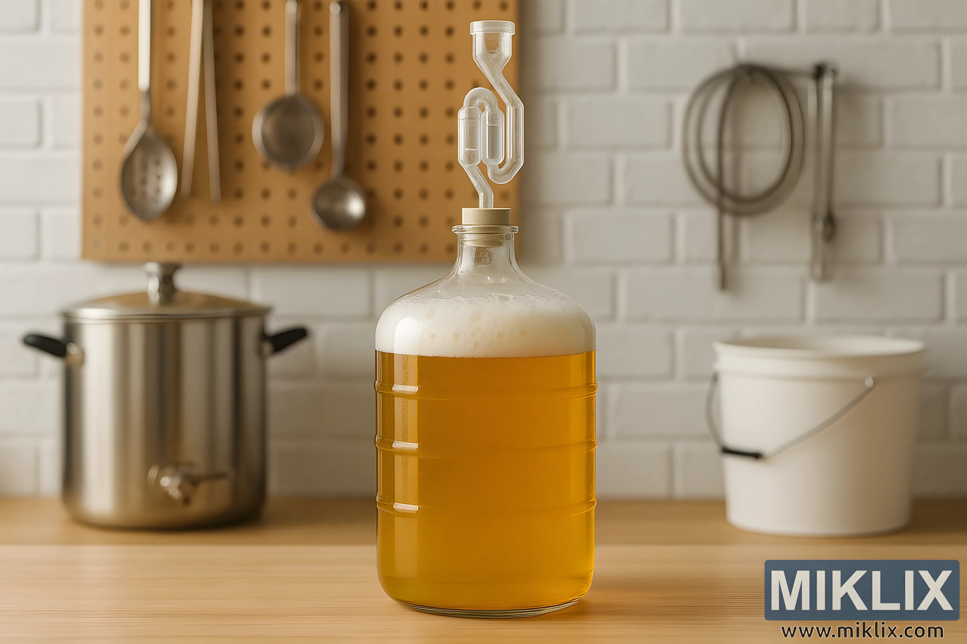 Slika prikazuje spokojno i organizirano okruženje za kućno pivovarstvo usmjereno na fermentaciju čistog, hrskavog piva lager stila. U središtu scene nalazi se prozirna staklena demižona koja služi kao posuda za fermentaciju, istaknuto postavljena na glatkoj, svijetloj drvenoj radnoj površini. Demižona je ispunjena zlatnom, slamnatom tekućinom karakterističnom za lager pivo, koja toplo svijetli dok hvata ambijentalno svjetlo iz dobro osvijetljene prostorije. Na vrhu piva formirao se tanki sloj bijelog, pjenastog krausena, znak aktivne fermentacije. Mali mjehurići prianjaju uz unutrašnjost čaše i lagano se dižu prema površini, doprinoseći osjećaju tekuće fermentacijske aktivnosti.