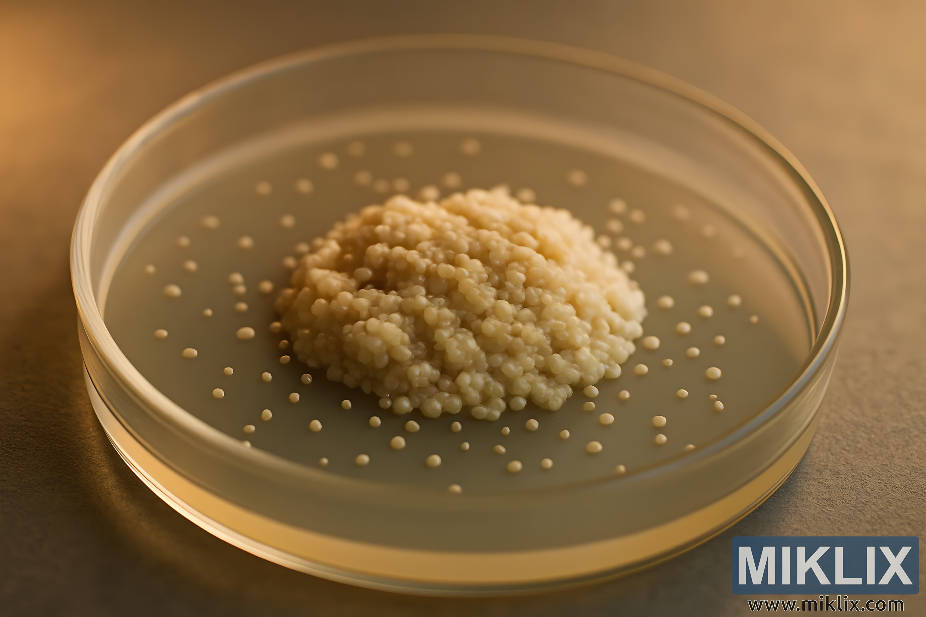 Slika prikazuje intiman, krupni plan kulture pivskog kvasca u lag fazi, snimljene unutar plitke, kružne Petrijeve zdjelice koja leži na suptilno teksturiranoj laboratorijskoj površini. Cijela kompozicija je okupana mekim, toplim osvjetljenjem koje kao da dolazi iz niskog kuta s lijeve strane, stvarajući izdužene, nježne sjene koje naglašavaju trodimenzionalni oblik i površinsku teksturu kolonije kvasca. Mala dubinska oštrina čini pozadinu nefokusiranom, omogućujući da se oko u potpunosti privuče središnjoj skupini kvasca, koja u svojoj strukturi izgleda gotovo skulpturalno.