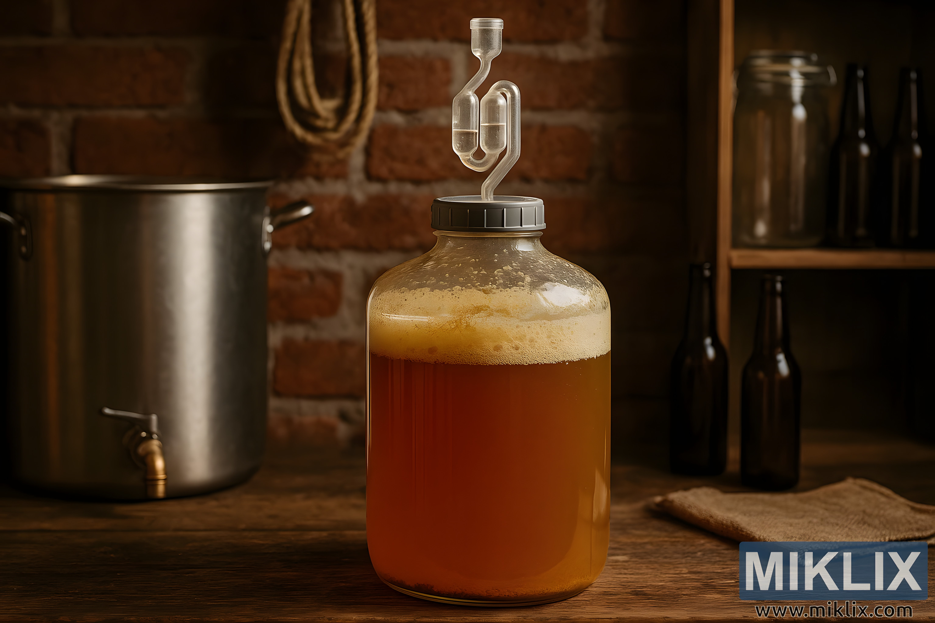 srcu kompozicije nalazi se čvrsta, prozirna staklena posuda za fermentaciju - ponekad nazvana demižon - koja leži izravno na starom drvenom radnom stolu. Posuda ima zaobljeno rame koje se sužava prema užem vratu, koji je čvrsto zatvoren sivim navojnim čepom s prozirnom zračnom komorom u obliku slova S. Zračna komora, napola napunjena tekućinom za dezinfekciju, stoji uspravno i istaknuto na mutnoj pozadini, a njezin zakrivljeni oblik suptilno kontrastira s ravnim okomitim tijelom posude. Vidljivi su sitni mjehurići koji se uzdižu kroz jantarno-zlatnu tekućinu unutra, a aktivni krausen - gusta, pjenasta, prljavobijela pjenasta kapa - pluta na vrhu piva, što ukazuje na snažnu fermentaciju. Krausen se neravnomjerno prianja uz staklene stijenke, ostavljajući slab, nepravilan prsten ostataka pjene odmah iznad trenutne linije tekućine. Tanak sloj žućkastosmeđeg sedimenta kvasca taložio se na samom dnu, vizualno uzemljujući kompoziciju.