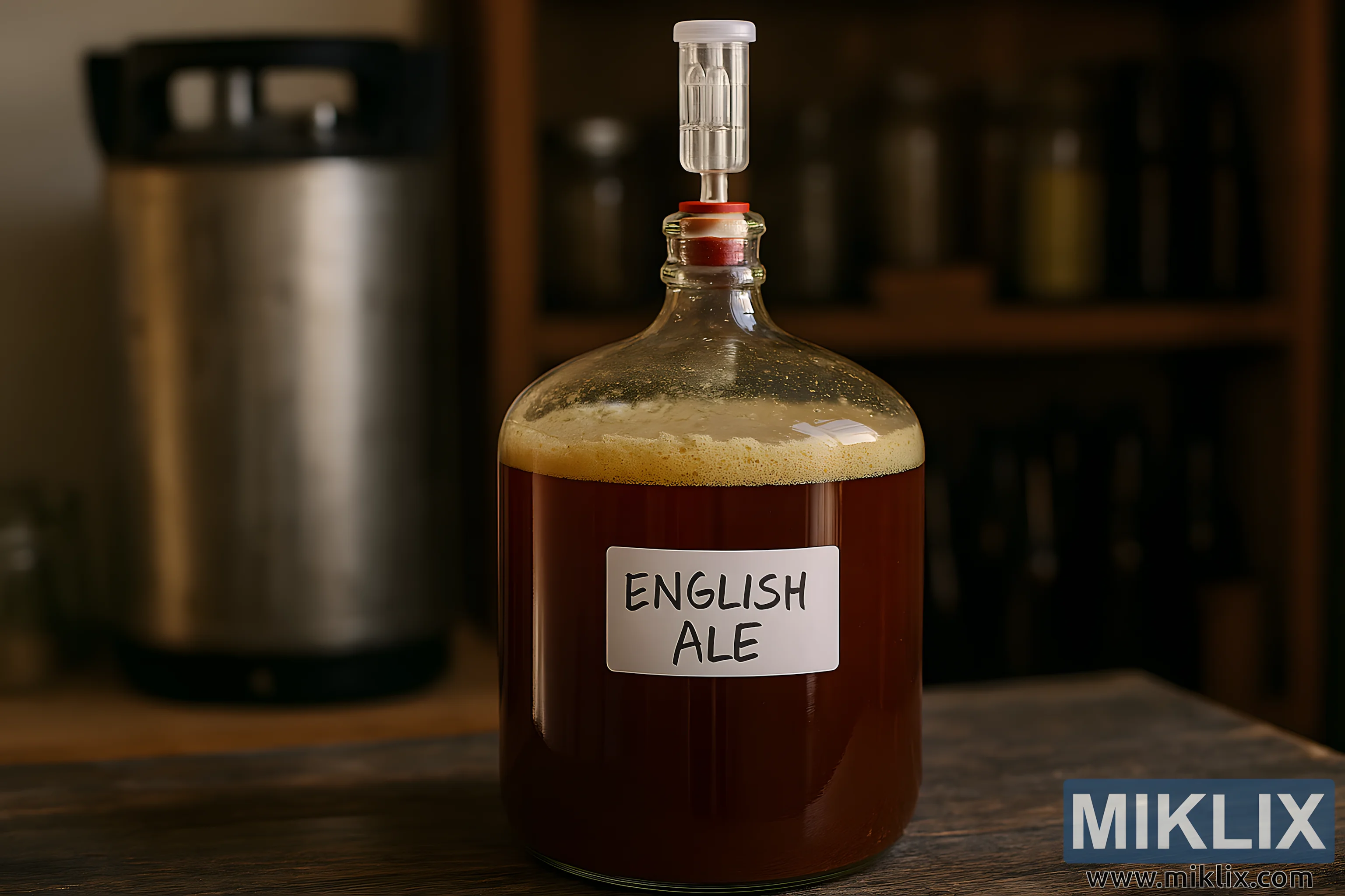 Topla, detaljna fotografija engleskog piva koje fermentira u staklenoj posudi, smještena u rustikalnom okruženju domaće pivare s prirodnim osvjetljenjem i opremom za kuhanje u pozadini.
