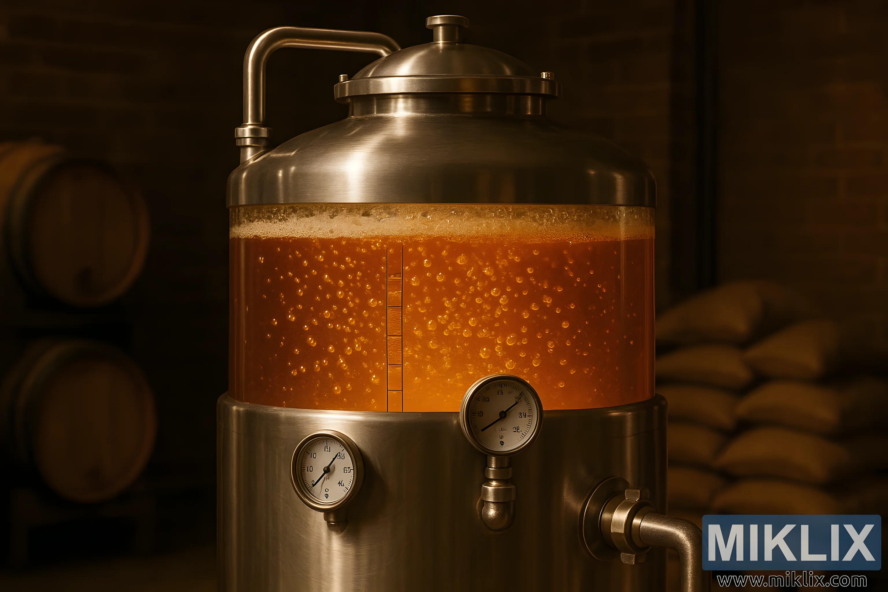 Na spremniku su pričvršćena dva manometra, njihovi brojčanici postavljeni poput budnih očiju, prateći unutarnje uvjete s tihim autoritetom. Ovi instrumenti, zajedno s termometrom, govore o znanstvenoj strogosti koja je temelj modernog pivarstva. Oni osiguravaju da okruženje unutar spremnika ostane stabilno i optimalno, štiteći osjetljivu ravnotežu potrebnu za rast kvasca i razvoj okusa kako je predviđeno. Prisutnost ovih mjerača dodaje sloj kontrole sceni, podsjećajući gledatelja da iako fermentacija može biti prirodan proces, on je onaj koji ima koristi od pažljivog upravljanja i tehničkog uvida.