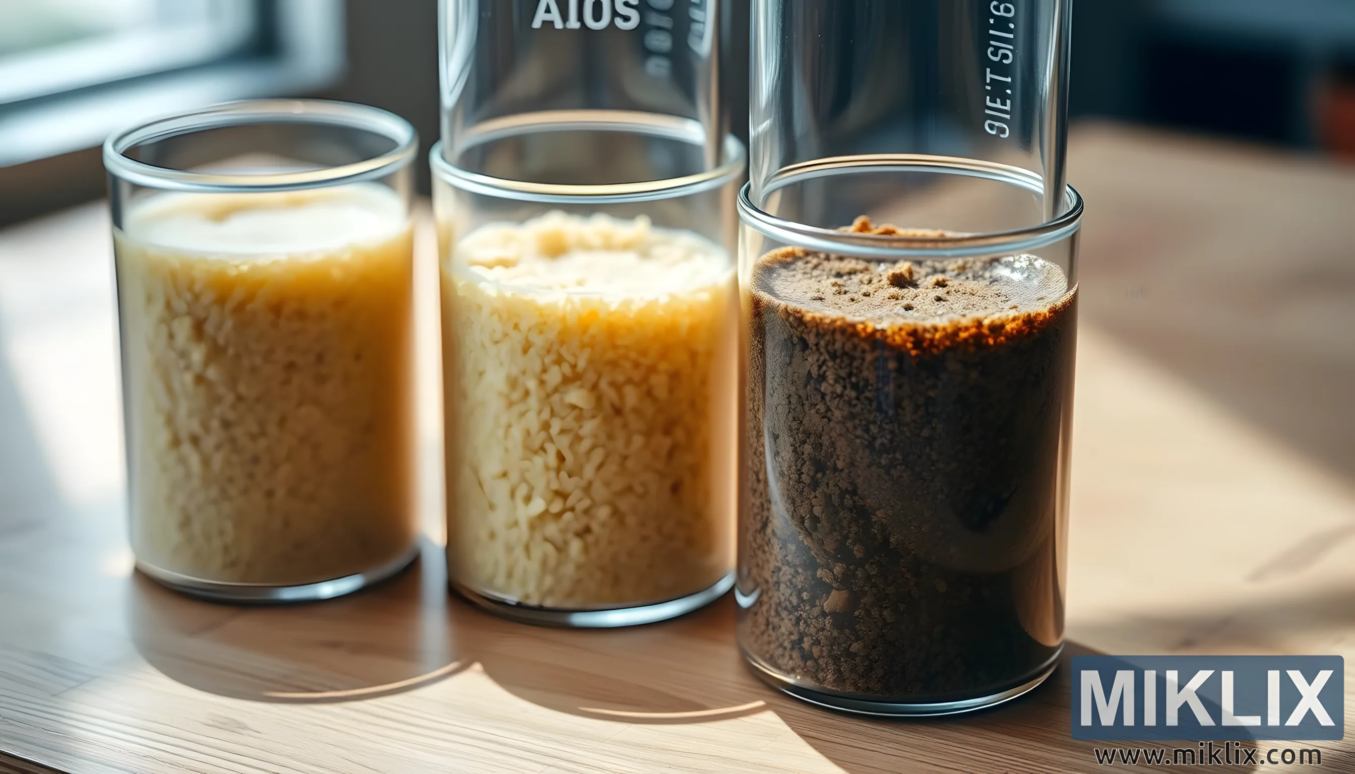 Ova slika nudi tih, ali uvjerljiv uvid u nijansirani svijet znanosti fermentacije, gdje i najmanje varijacije u teksturi, boji i sastavu mogu imati dubok utjecaj na okus, aromu i performanse kuhanja. Na toploj drvenoj površini uredno su raspoređene tri prozirne staklene posude, svaka napunjena različitom vrstom granulirane ili praškaste tvari. Iako se slika na prvi pogled može činiti jednostavnom, njezina kompozicija i osvjetljenje uzdižu je u studiju kontrasta i detalja, pozivajući gledatelja da razmotri suptilne složenosti svakog uzorka.