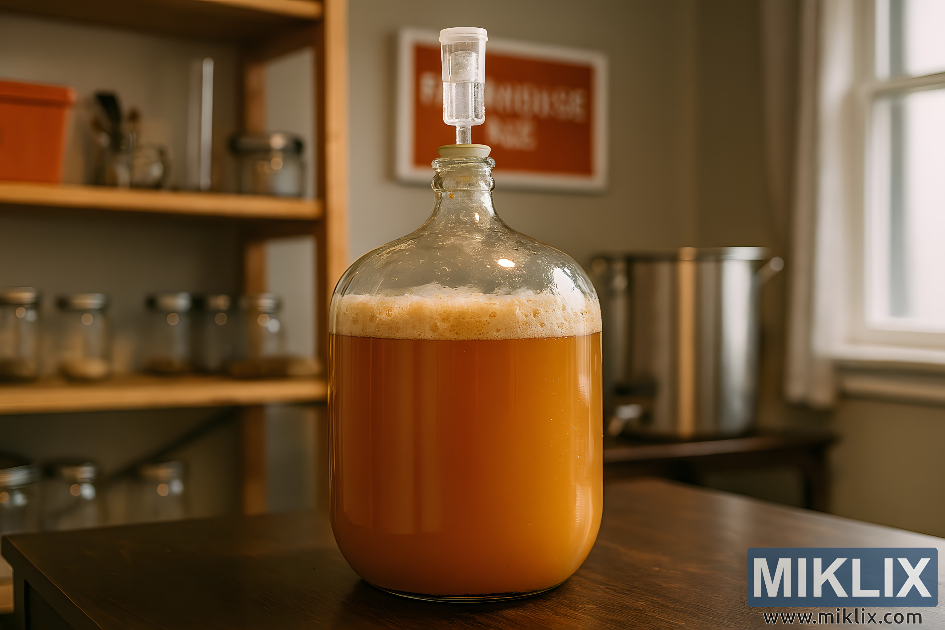 Demižon stoji na tamnom drvenom stolu s vidljivim godovima i blago istrošenom površinom, dodajući rustikalni šarm. Meko prirodno svjetlo s obližnjeg prozora baca nježne naglaske i sjene na stol i demižon, pojačavajući tople tonove piva i drva. U pozadini, niz otvorenih drvenih polica izrađenih od svijetlog drva sadrži razne potrepštine za pivo. Na gornjoj polici nalazi se crvena plastična posuda i visoki graduirani cilindar. Srednja polica prikazuje nekoliko staklenki s metalnim poklopcima, neke sadrže žitarice ili hmelj. Donja polica sadrži dodatne staklenke i boce, doprinoseći autentičnom ambijentu domaćeg pivarstva.