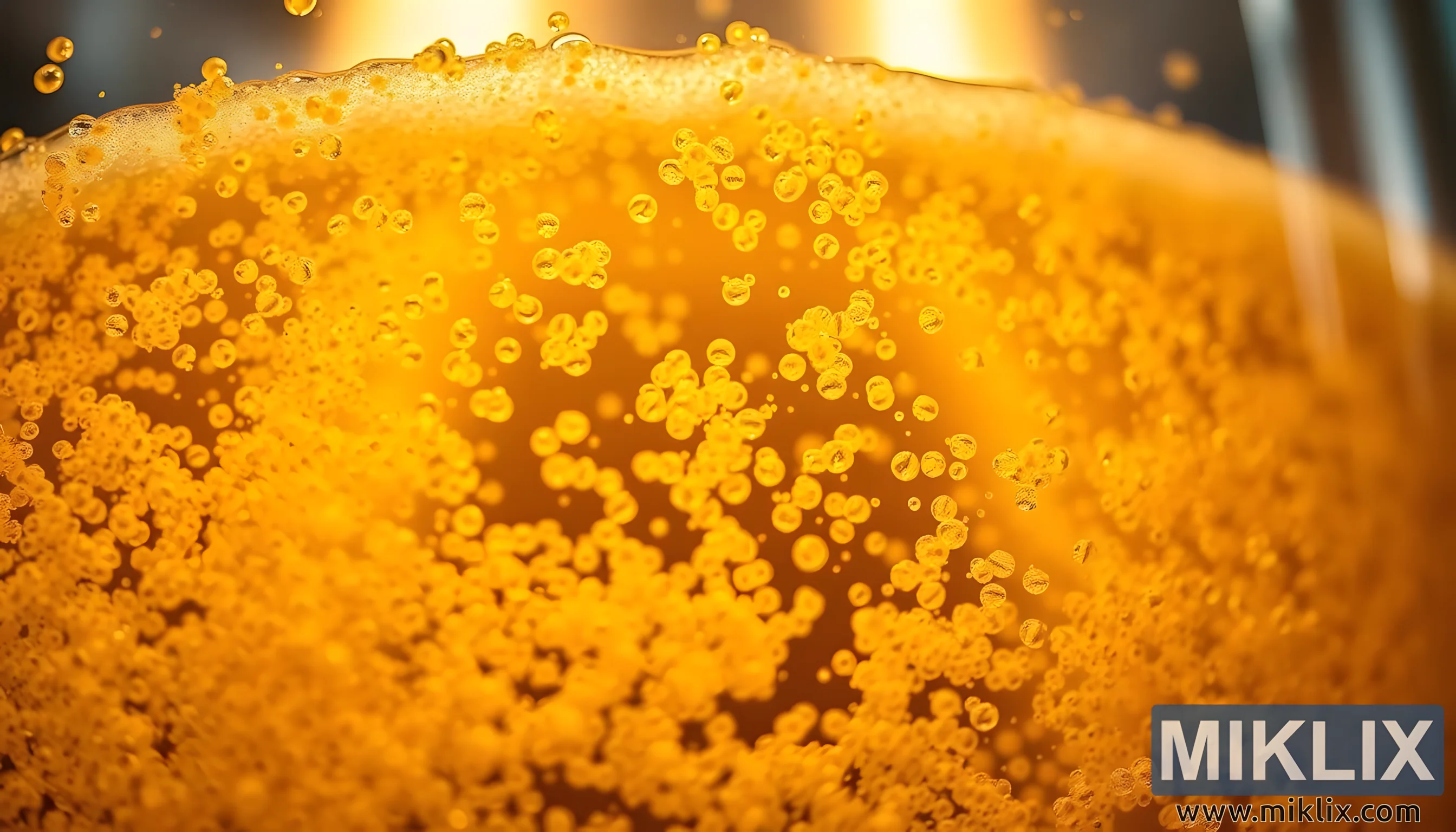 Krupni plan stanica kvasca koje fermentiraju pivo, prikazuje zlatnu mjehurićavu sladovinu i složeni proces fermentacije piva.