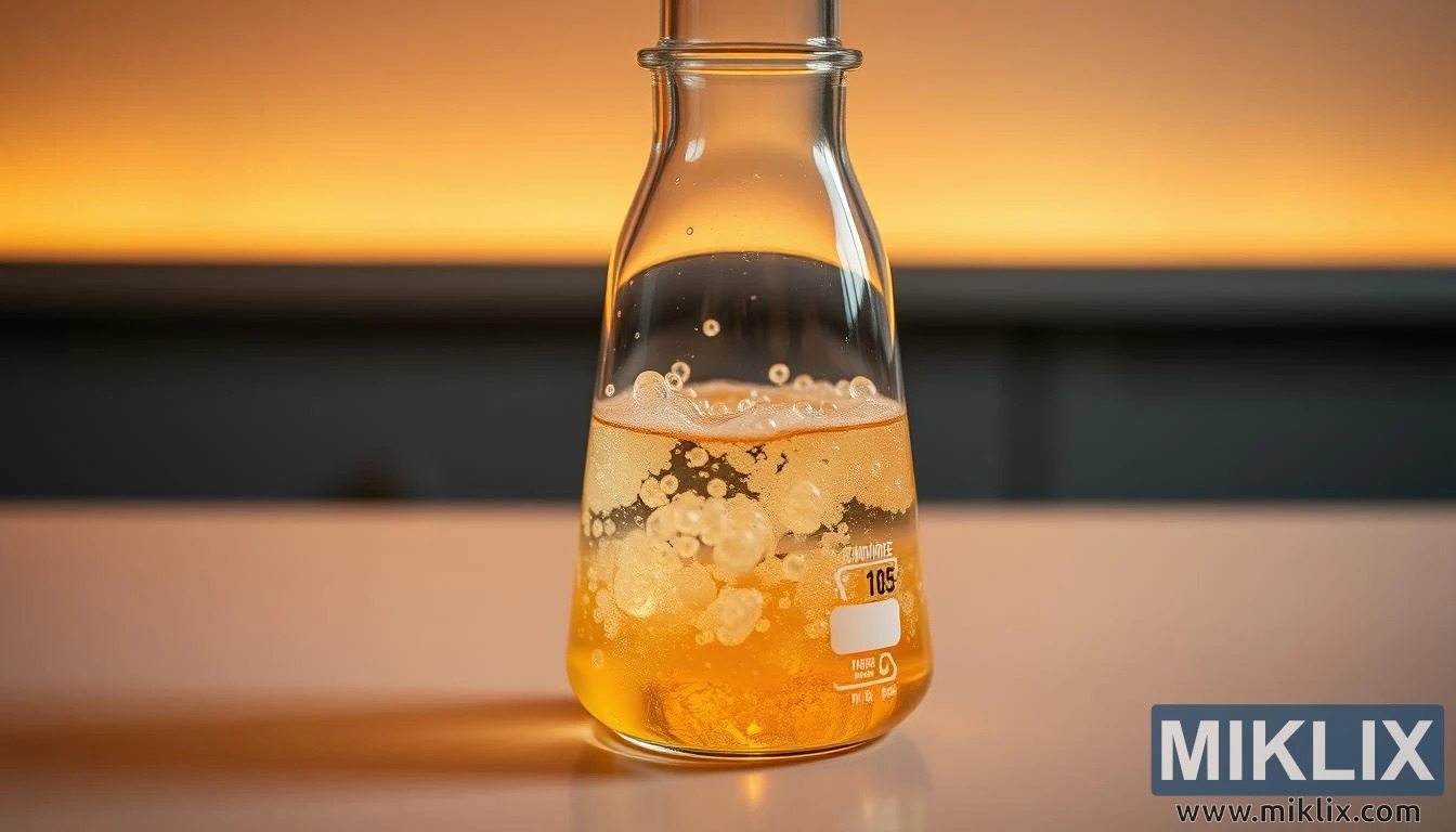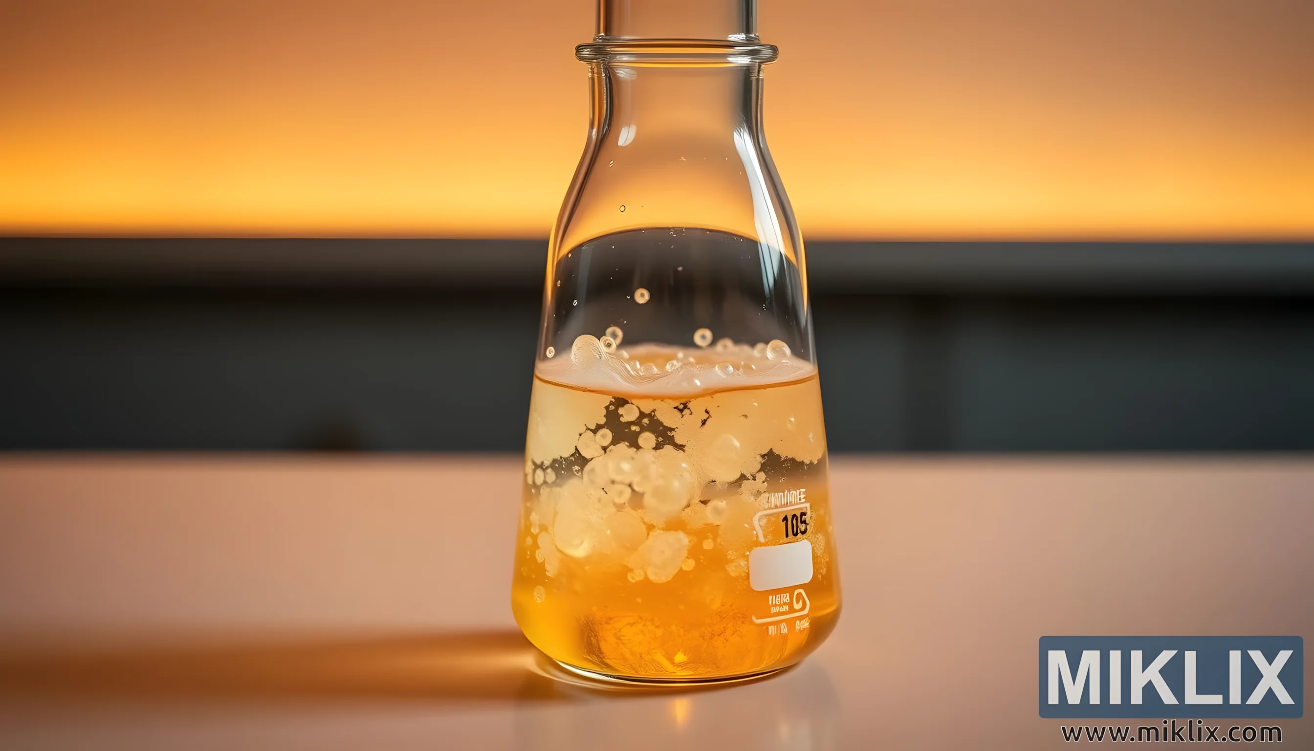 Ova slika prikazuje trenutak živahne biološke aktivnosti unutar kontroliranog laboratorijskog okruženja, gdje se nevidljivi mehanizmi fermentacije prikazuju kroz prizmu znanstvenog promatranja i estetske kompozicije. U središtu scene nalazi se prozirna Erlenmeyerova tikvica, konusnog oblika ispunjena zlatnožutom tekućinom koja mjehuri i vrcka s nepogrešivom energijom. Unutar tekućine suspendirane su bijele globule - moguće emulgirane kapljice ili kolonije kvasca - od kojih svaka doprinosi vrtložnom kretanju koje oživljava sadržaj. Pjenušanje je živahno i kontinuirano, s mjehurićima koji se uzdižu u nježnim mlazovima, tvoreći pjenasti sloj na vrhu koji nagovještava metaboličku snagu procesa fermentacije u tijeku.
