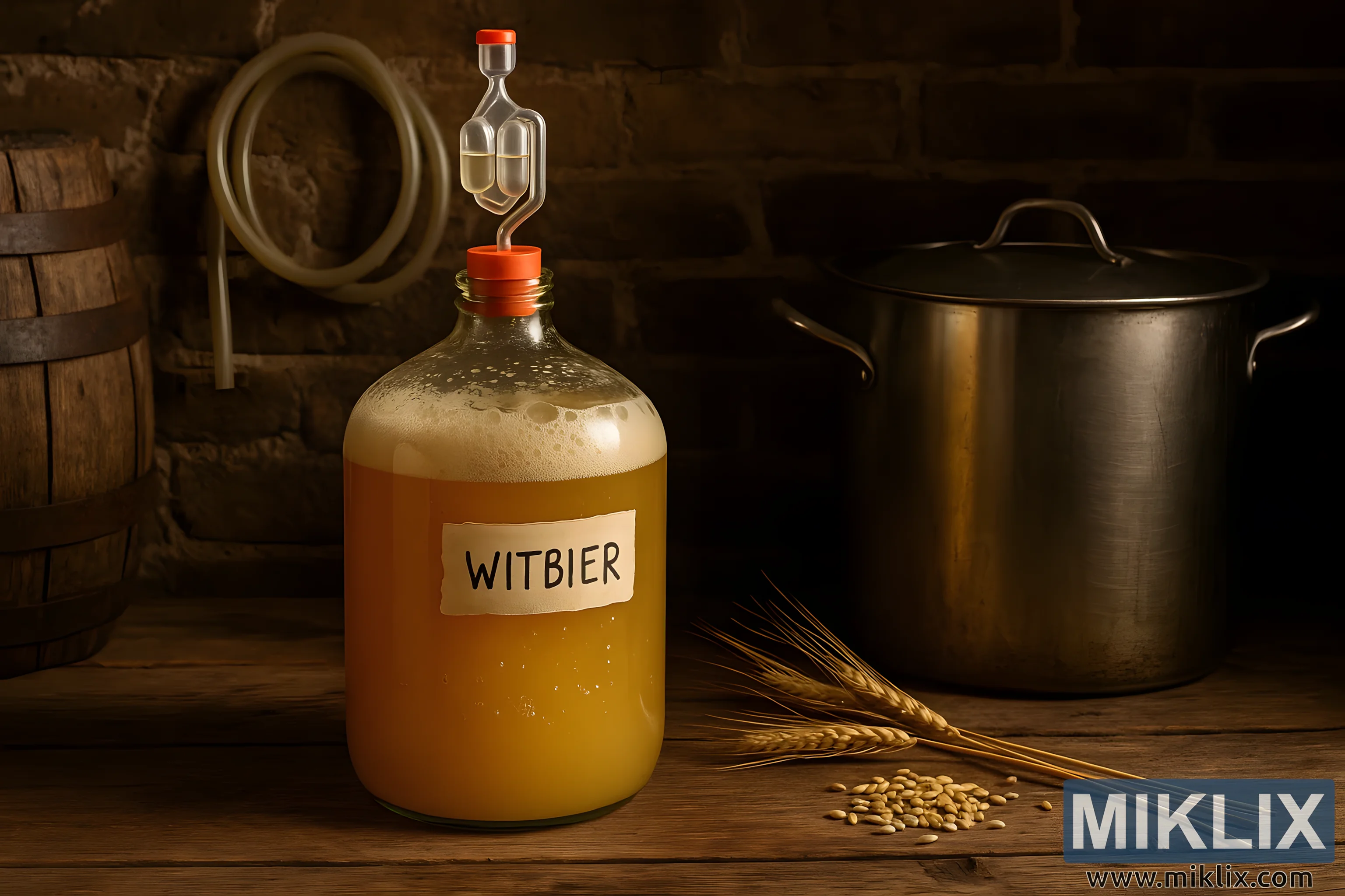 Fotografija prikazuje rustikalni kućni pivarski ambijent u toplo osvijetljenom okruženju, kojim dominira središnji dio staklene demižone napunjene fermentirajućim witbierom. Demižona stoji na gruboj drvenoj površini koja pokazuje tragove starosti i korištenja, a daske imaju ogrebotine, pukotine i neravne teksture koje govore o godinama pivarstva. Sam fermentor je velik i okrugao s blago kosim ramenima koja se sužavaju u uski vrat, koji je zatvoren jarko narančastim gumenim čepom. Iz čepa izlazi klasična plastična zračna komora djelomično napunjena tekućinom, detalj koji ističe aktivan proces fermentacije koji se odvija unutra.