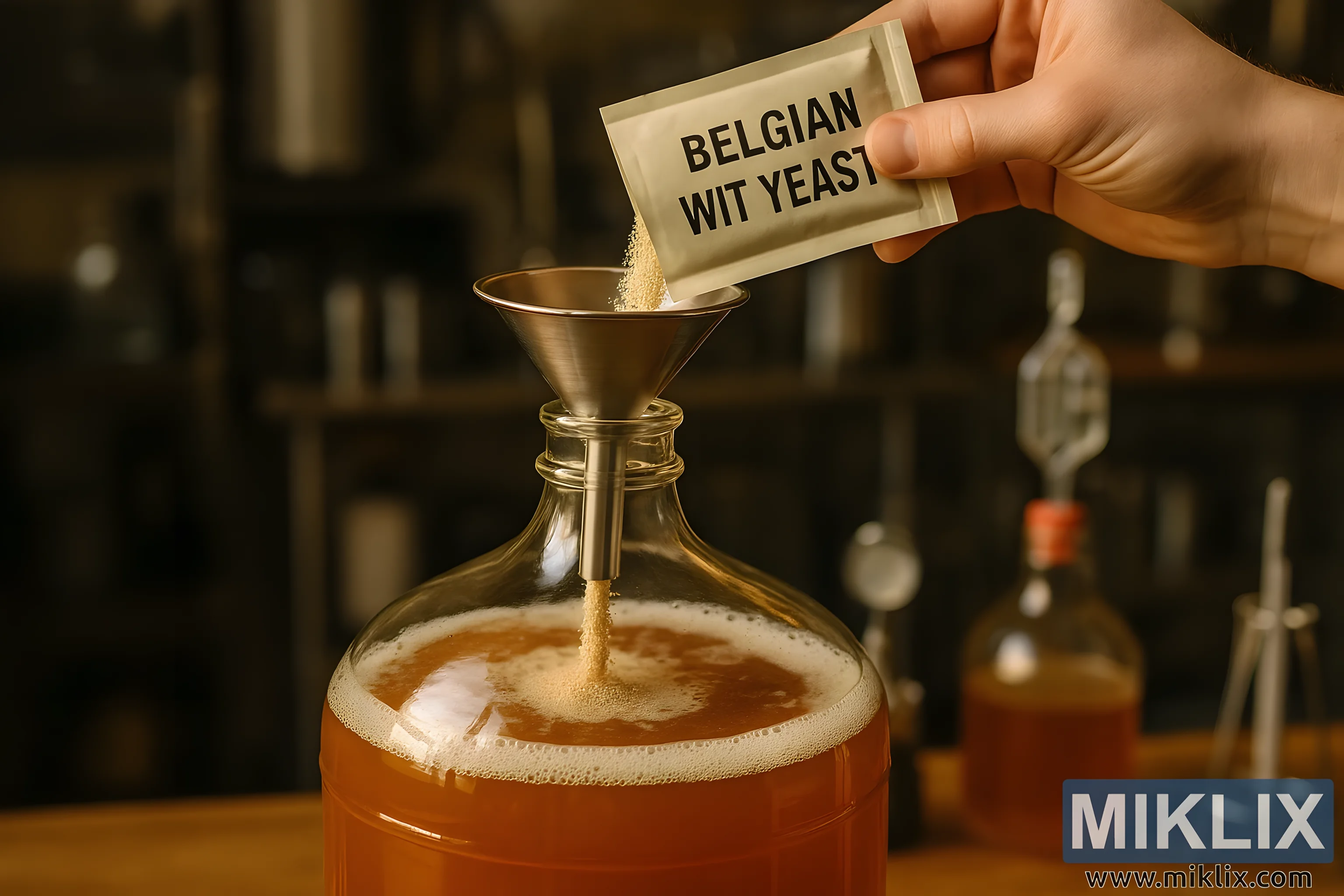 Iznad uskog grla demižona pažljivo je postavljen lijevak od nehrđajućeg čelika koji vodi kvasac u tekućinu. Lijevak, poliran i blago reflektirajući, sjaji pod toplim svjetlom, stojeći kao alat preciznosti u inače fluidnom i organskom procesu. Iz gornjeg desnog kuta slike ruka nježno naginje vrećicu označenu podebljanim crnim slovima: „BELGIAN WIT YEAST“ (BELGIJSKI KVASAC S KVASCOM). Dok se vrećica naginje pod kutom, fina zrnca kvasca padaju prema dolje u nježnom mlazu, a njihov luk je zabilježen usred kretanja. Kvasac izgleda zlatno-bež, gotovo se stapa sa sladovinom, ali je prepoznatljiv dok ravnomjerno teče kroz lijevak i u posudu ispod.