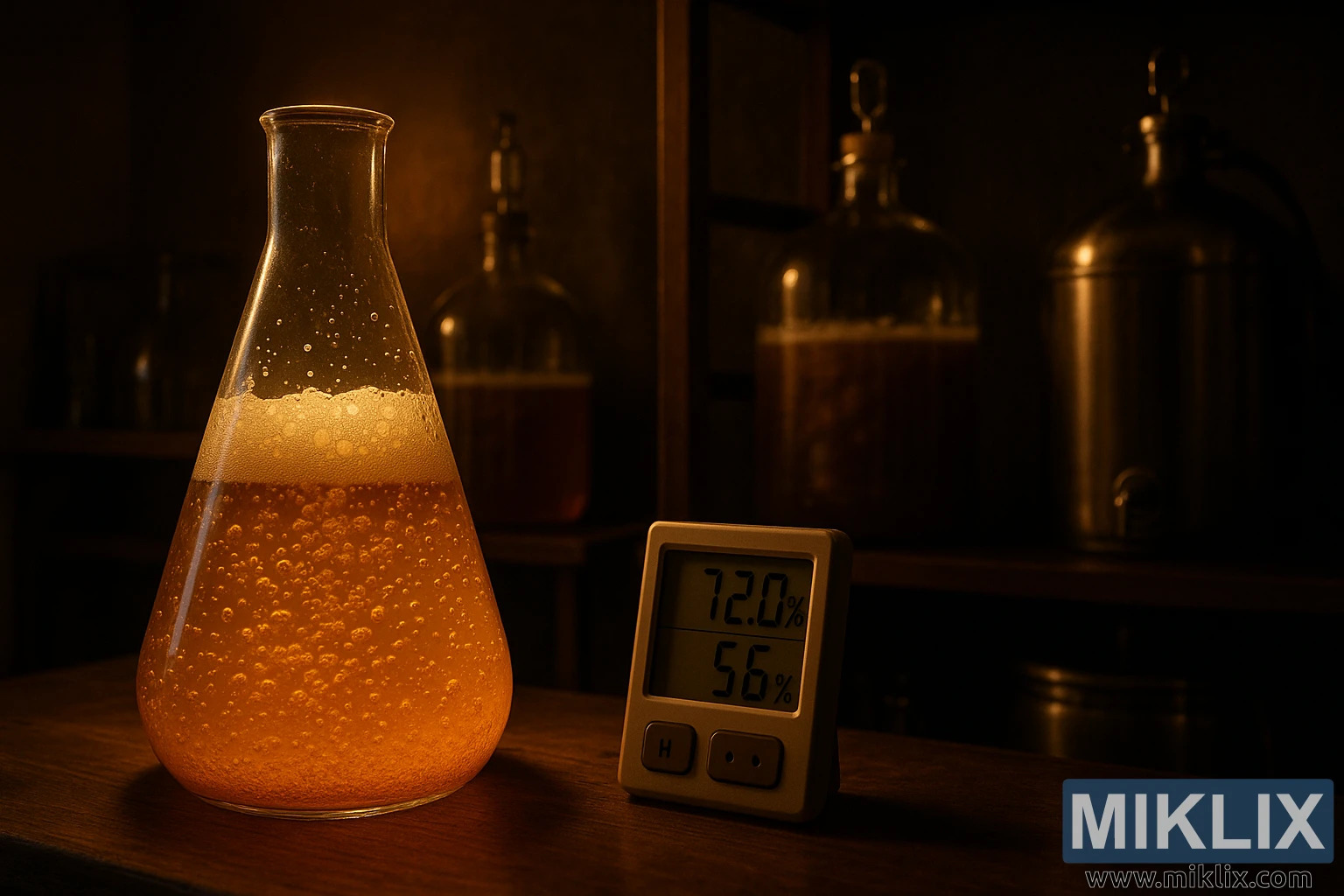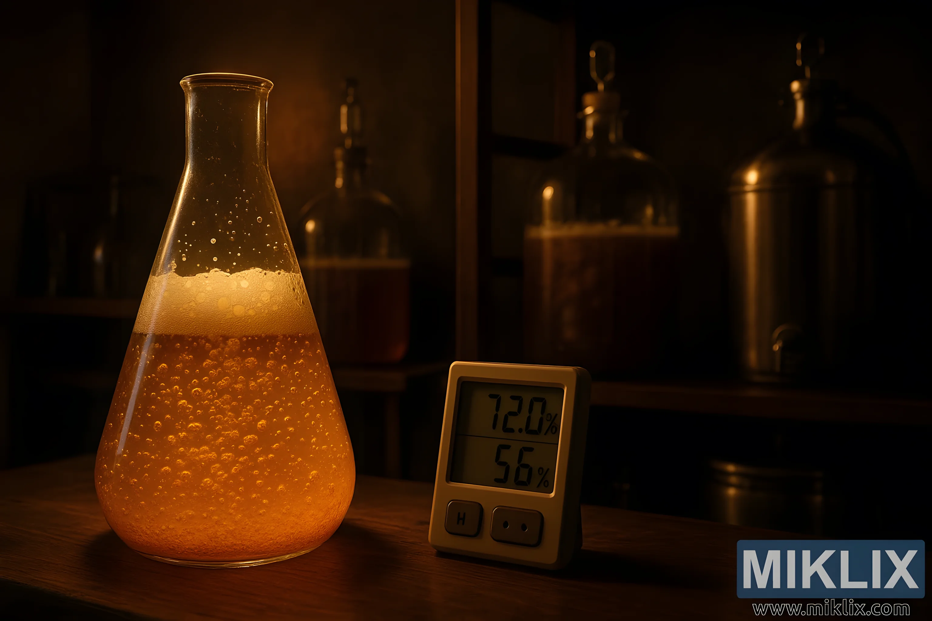 Odmah pored čaše, digitalni termometar-higrometar lagano svijetli, prikazujući temperaturu od 22,1 °C i razinu vlažnosti od 56%. Ova očitanja nisu slučajna - ona predstavljaju pažljivo održavano okruženje prilagođeno potrebama pivskog kvasca, koji najbolje funkcionira u ovom toplom, blago vlažnom rasponu. Prisutnost ovog uređaja za praćenje naglašava predanost pivara kontroli i dosljednosti, gdje su čak i uvjeti okoline dio recepta. To je suptilan, ali snažan podsjetnik da fermentacija nije samo biološki proces, već dijalog između organizma i okoliša, vođen ljudskim rukama i informiran iskustvom.
