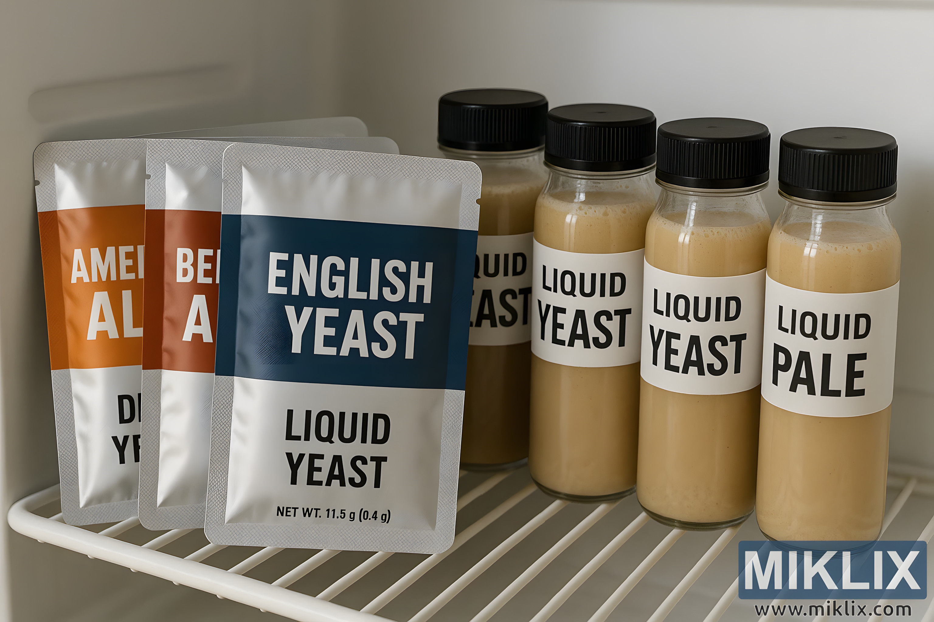 Desno od paketića, četiri prozirne boce tekućeg kvasca poredane su s jednakom pažnjom. Ove su boce napunjene kremastom, svijetlosmeđom suspenzijom, a suspendirane stanice kvasca vidljive su kroz prozirnu plastiku. Konzistencija tekućine sugerira svježinu i aktivnost, živu kulturu spremnu za ubacivanje u slad. Svaka boca ima bijelu etiketu s podebljanim crnim tekstom "LIQUID YEAST" ili "LIQUID PALE", što označava ili soj ili željeni stil piva. Ujednačenost etiketa i jasnoća boca doprinose općem osjećaju urednosti i profesionalnosti.