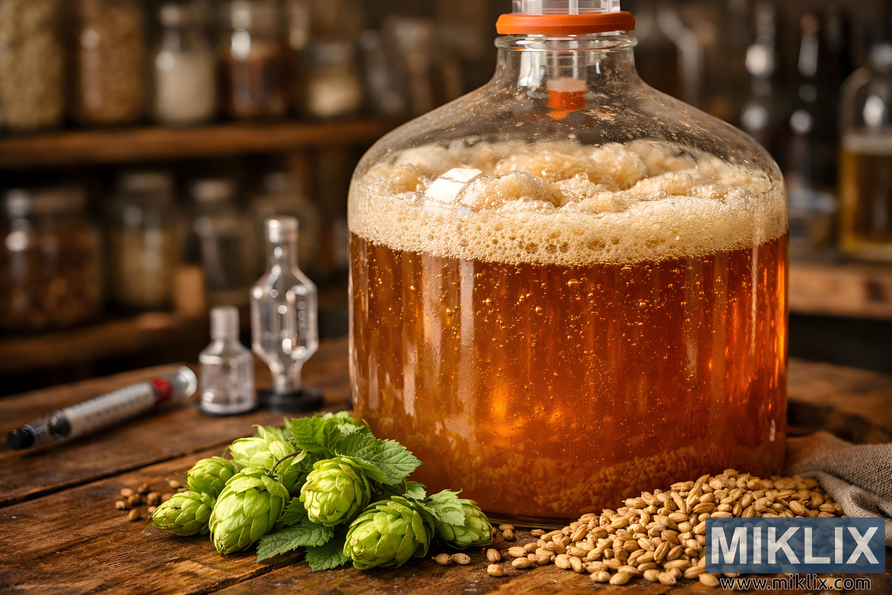 Golden Amber Beer Fermenting in a Cozy Homebrewing Setup