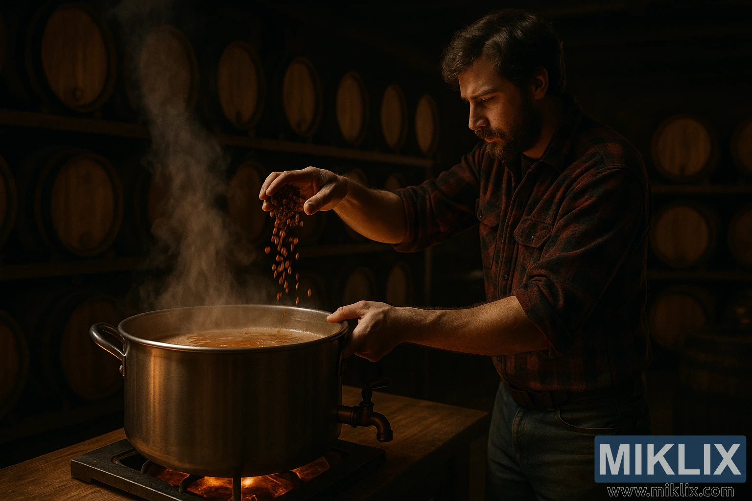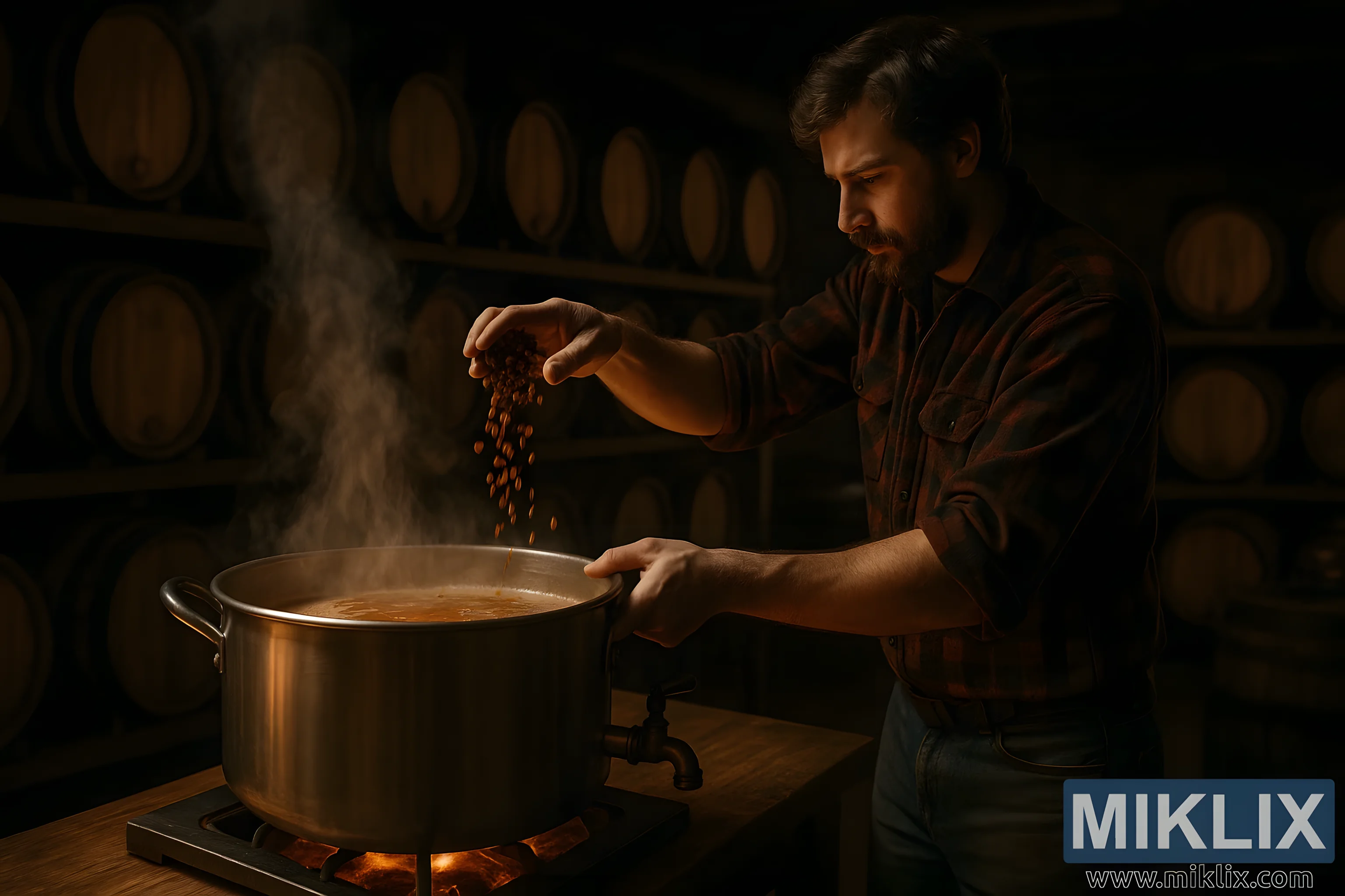 Topla scena iz pivnice s kotlom za kuhanje koji se pari, radnikom koji dodaje tostirani slad i hrastovim bačvama u pozadini, što evocira tradiciju i obrtništvo.