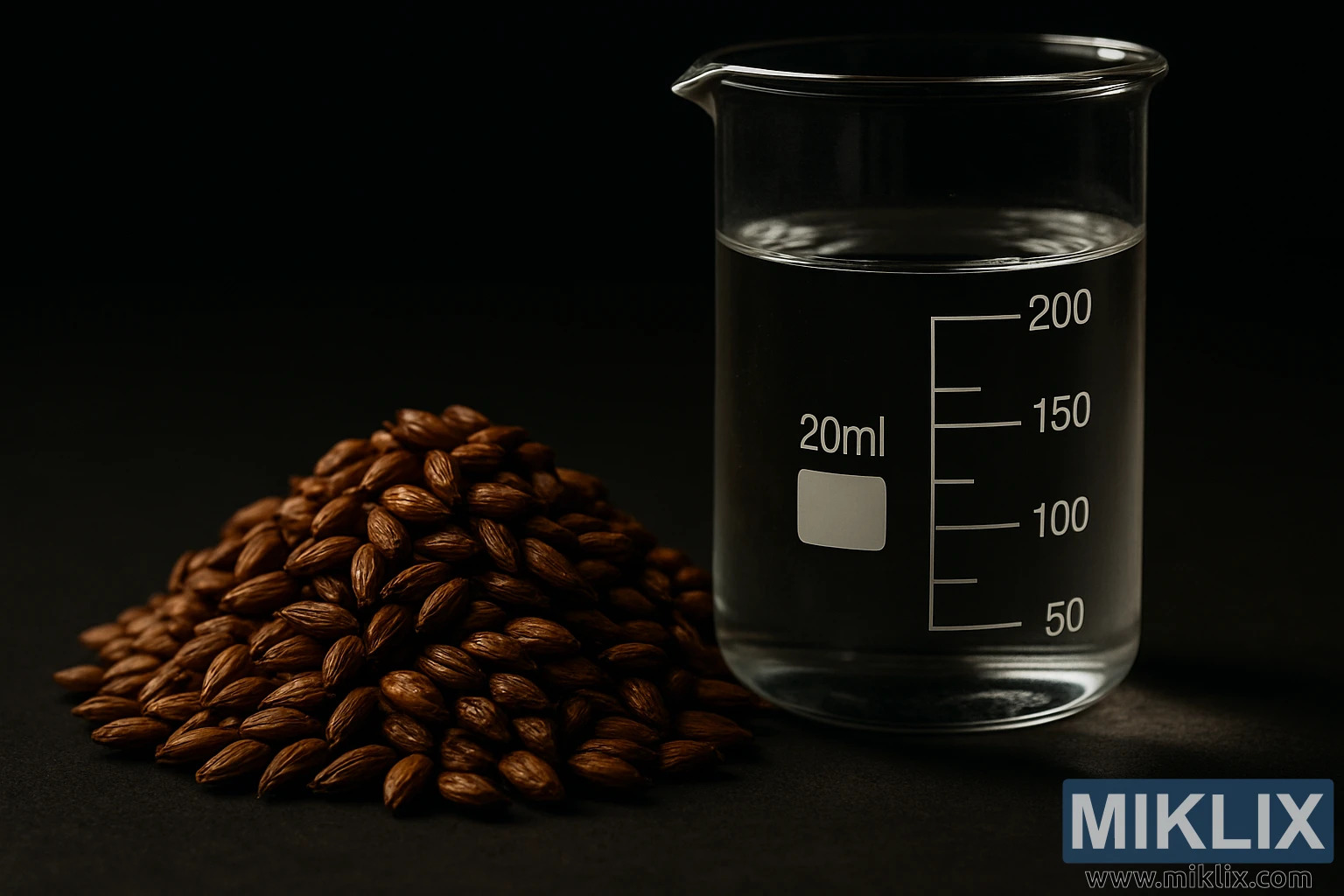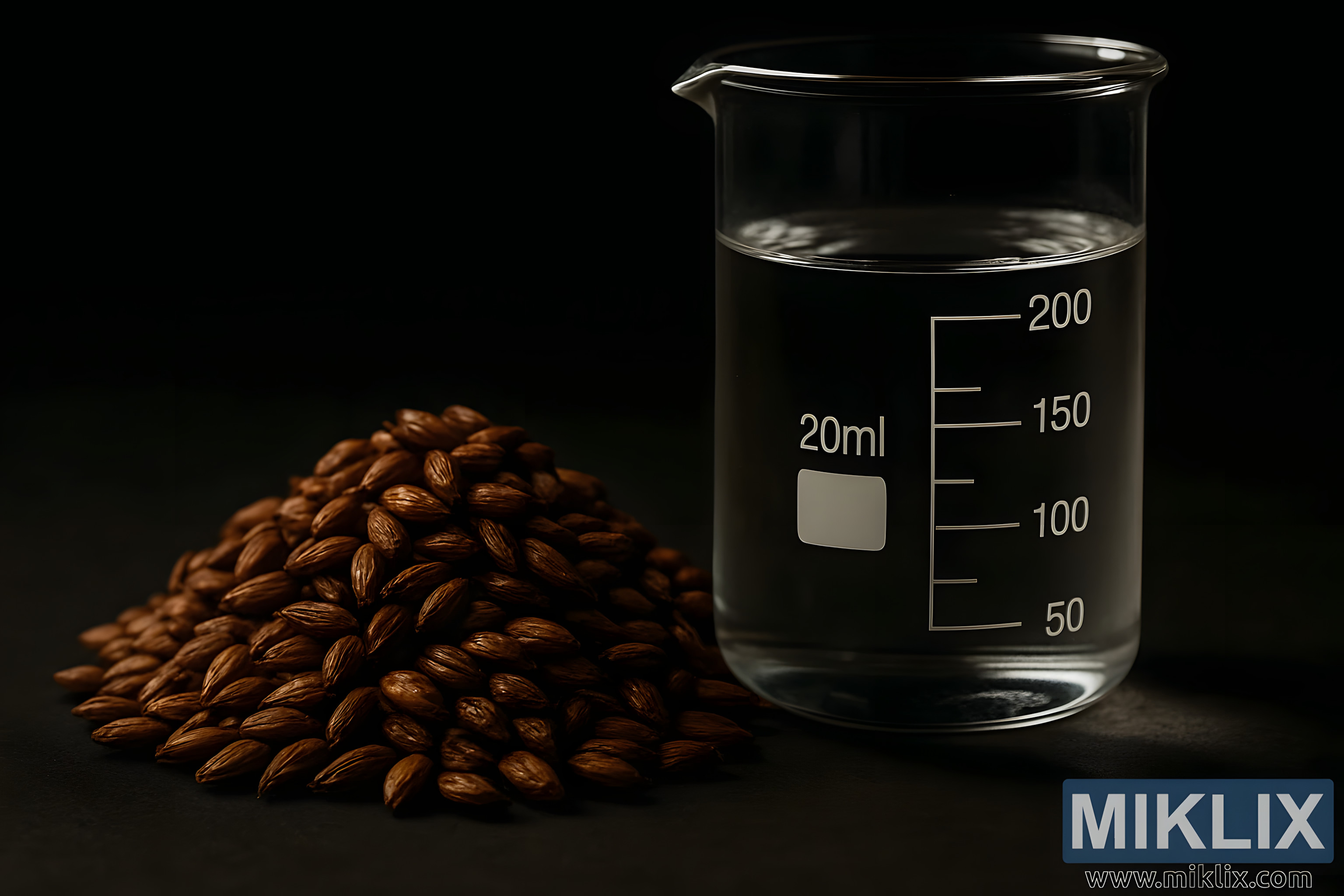 Pored zrna, uspravno stoji prozirna staklena čaša, napunjena čistom vodom i označena preciznim mjerenjima volumena. Čiste linije čaše i znanstvene oznake u kontrastu su s organskom nepravilnošću slada, naglašavajući dvojaku prirodu pivarstva kao umjetnosti i znanosti. Voda unutra je mirna, njezina površina hvata svjetlost i reflektira tople tonove obližnjeg slada. Ova jukstapozicija jasnoće i složenosti ukazuje na važnost kemije vode u pivarstvu - kako pH razine, sadržaj minerala i temperatura međusobno djeluju sa sladom oblikujući okus, osjećaj u ustima i dinamiku fermentacije. Čaša je više od posude; to je simbol kontrole, sposobnosti pivara da fino podesi proces i izvuče najbolje iz svake serije.