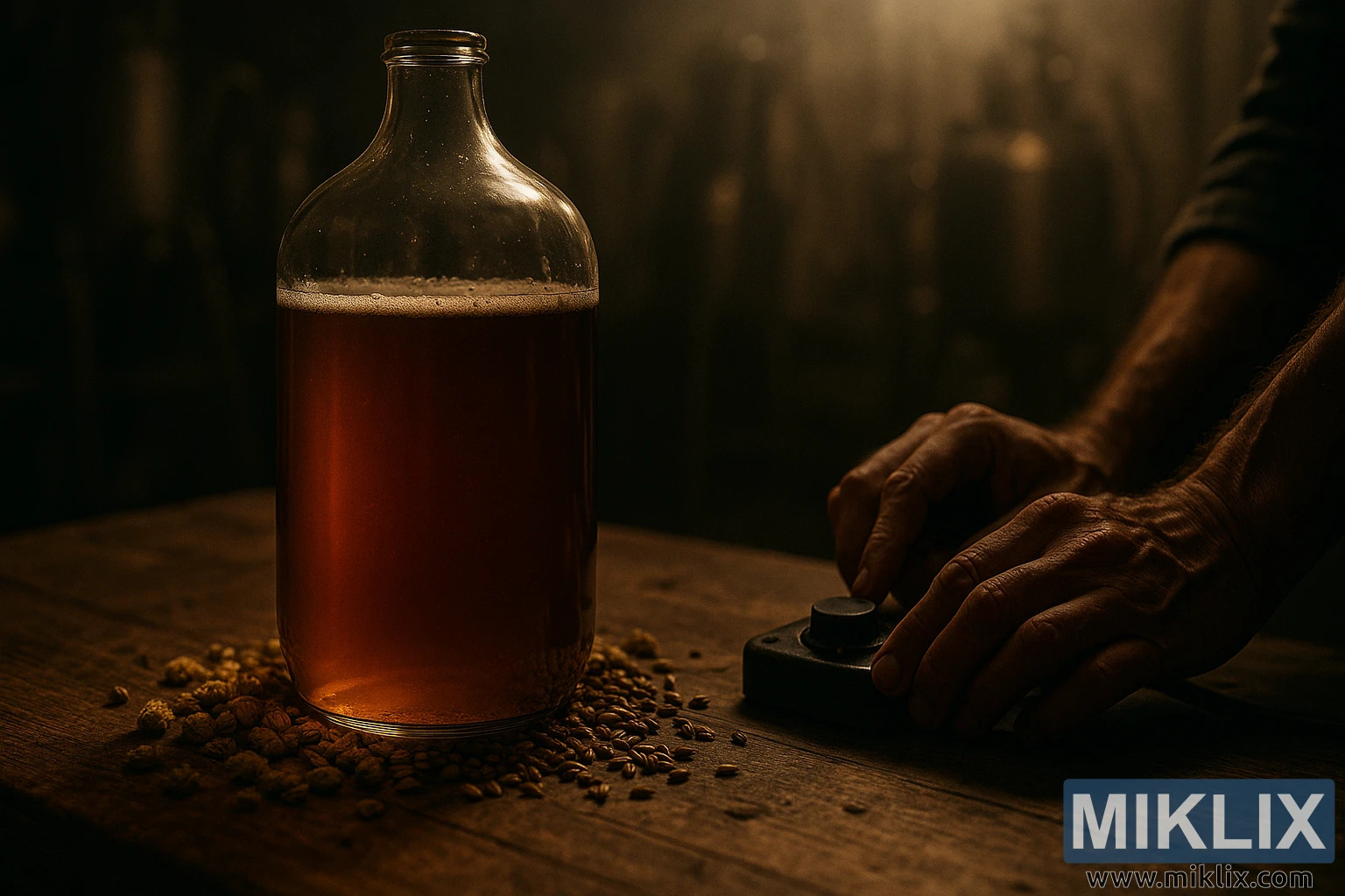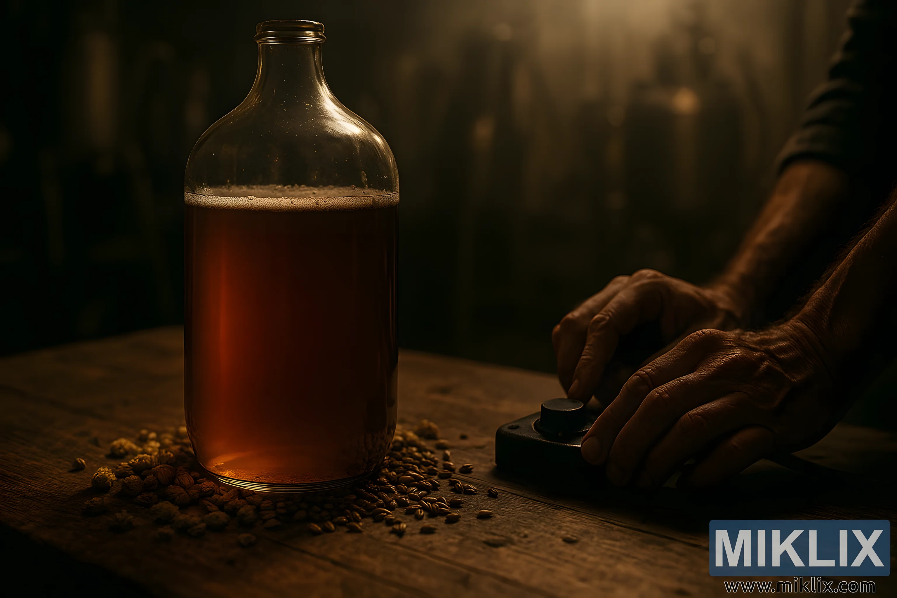 prostoru koji djeluje istovremeno intimno i radišno, slika bilježi trenutak tihe koncentracije unutar slabo osvijetljene stanice za kuhanje piva. Scena je u prvom planu okružena istrošenim drvenim stolom, čija je površina bogata karakterom - ogrebotinama, mrljama i patinom godina korištenja. Na stolu leži velika staklena demižona, čije su zakrivljene stijenke ispunjene tamno jantarnom tekućinom koja nježno svijetli pod toplim, usmjerenim osvjetljenjem. Nijansa tekućine sugerira pivo s izraženim sladnim okusom, vjerojatno prožeto jantarnim sladom, poznatim po svom tostiranom okusu nalik keksa i dubokim karamelnim podtonovima. Bistrina demižone otkriva blago kretanje unutra, možda rane znakove fermentacije ili preostali vrtlog od nedavnog točenja.