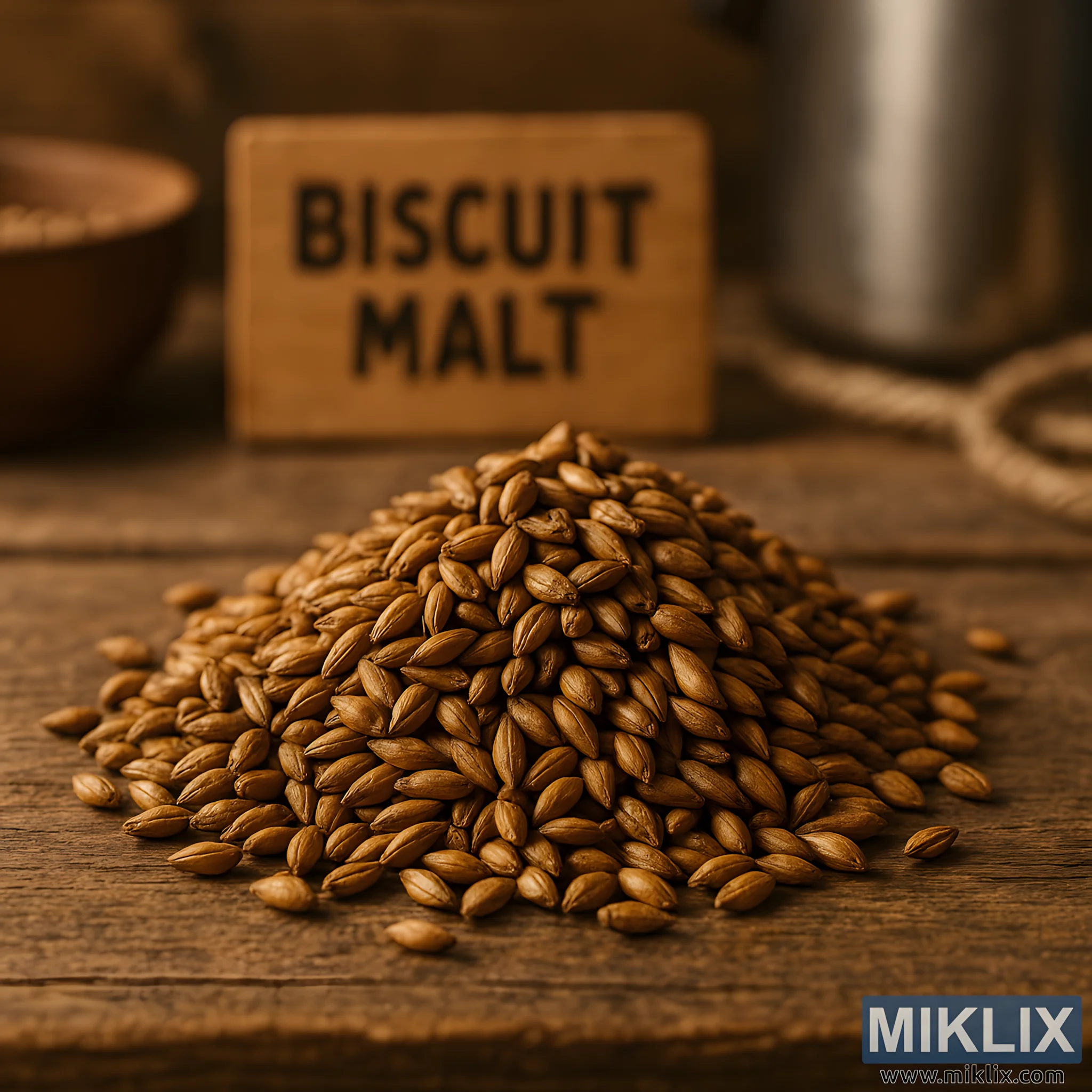 Topla, ambijentalna rasvjeta dominira slikom, bacajući zlatni ton po sceni i pojačavajući prirodne boje slada i drveta. Sjene su mekane i difuzne, stvarajući dubinu bez oštrog kontrasta. Opće raspoloženje je mirno, zanatske i privlačne, prenoseći osjećaj tradicije, strpljenja i umješnosti. Kompozicija djeluje namjerno, a opet prirodno, kao da je snimljena tijekom tihog trenutka pripreme prije početka kuhanja piva. Sveukupno, slika funkcionira i kao detaljna vizualna studija Biscuit Malta i kao atmosferski prikaz malog, rustikalnog kućnog pivarstva.