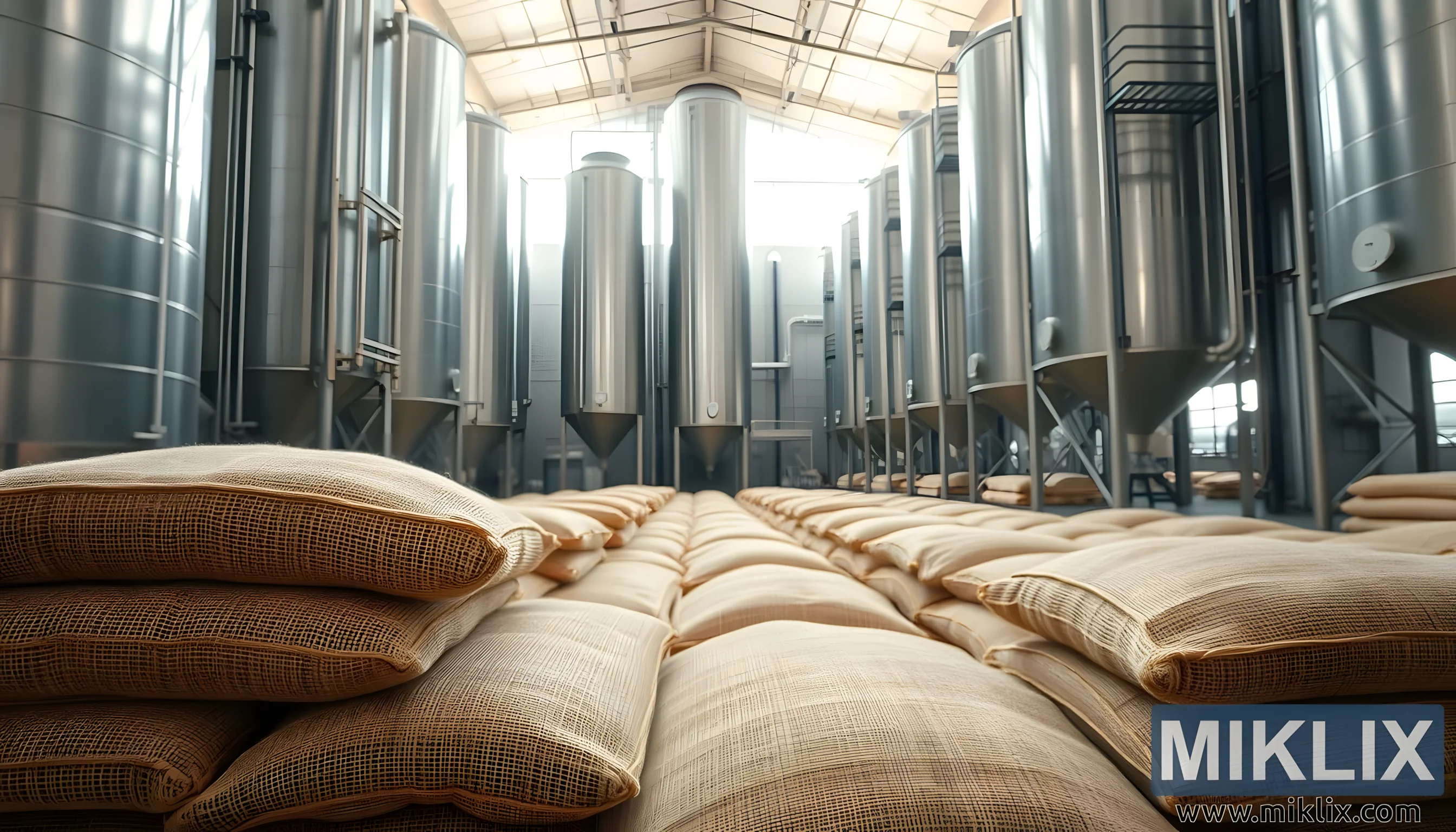 Prostrano skladište slada s vrećama od jute za svijetli slad, visokim čeličnim silosima i sustavima regala, s naglaskom na red, čistoću i kvalitetu sastojaka.