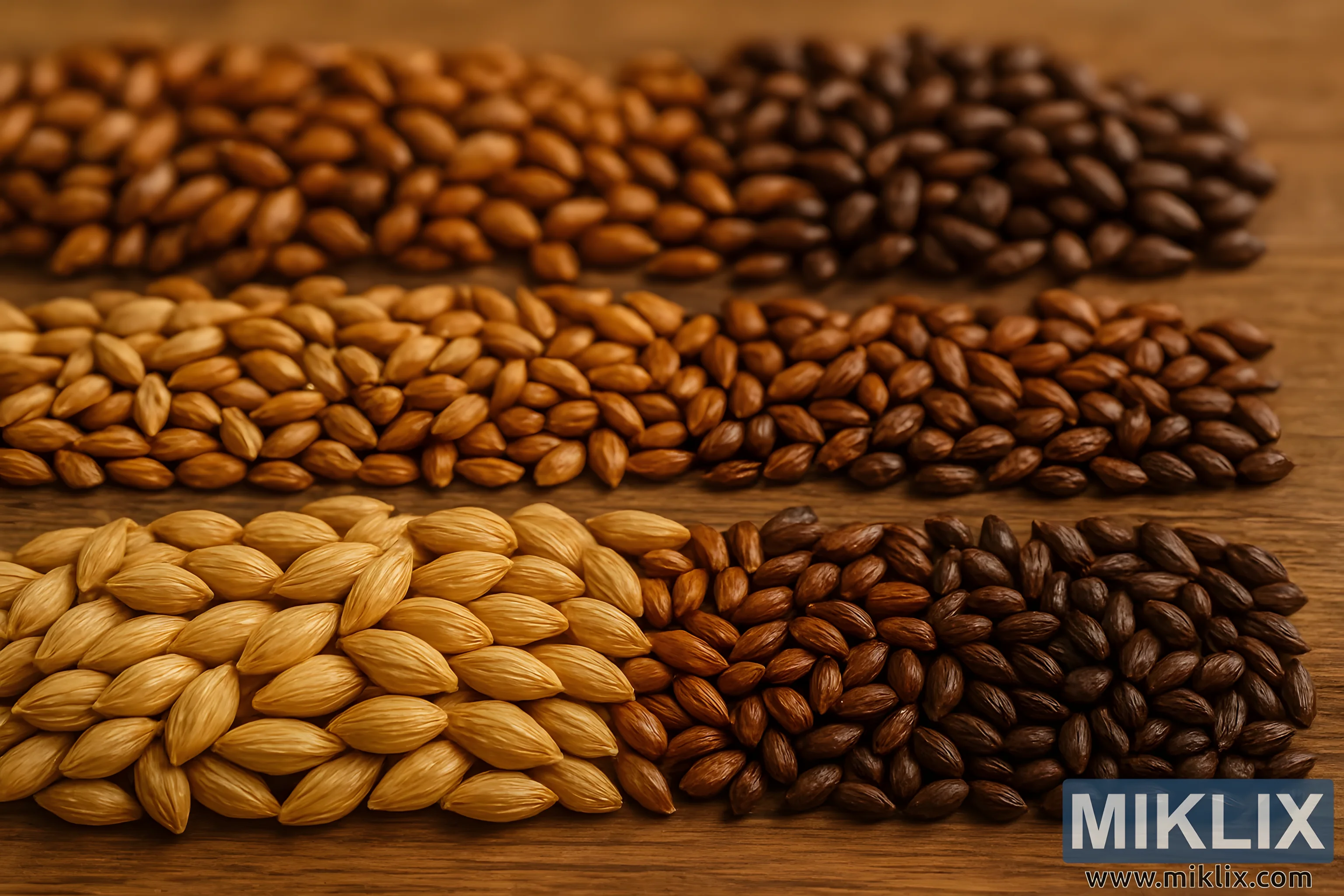 Krupni plan svijetlih i specijalnih sladova poput karamele, Münchena i čokolade, aranžiranih na drvu s toplim osvjetljenjem kako bi se istaknule njihove boje i teksture za kuhanje.