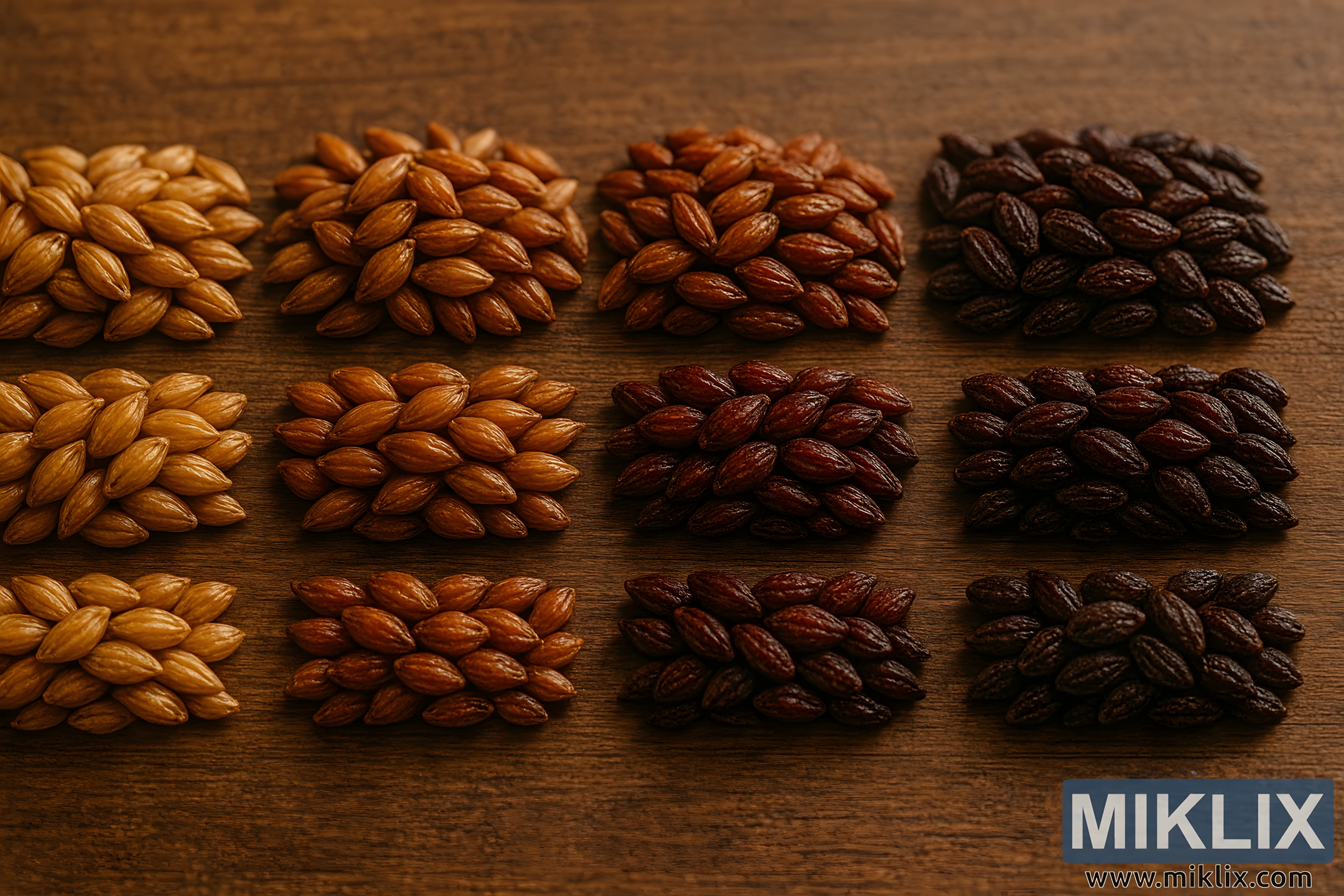 Svjetliji sladovi u gornjem lijevom kvadrantu svjetlucaju jantarnim i mednim tonovima, njihove zrna su punašna i glatka, što sugerira blago prženje koje čuva mnogo izvorne slatkoće i enzimske aktivnosti. Ovi sladovi se obično koriste za dodavanje tijela i suptilne karamelne note lakšim stilovima piva, poput zlatnih aleova ili blagih gorkih piva. Kako se oko dijagonalno pomiče preko mreže, boje se produbljuju, a teksture postaju izraženije. Kristalni sladovi srednje klase, sa svojim bakrenim i spaljenim narančastim nijansama, nude složeniji profil okusa - počinju se pojavljivati note karamele, tostiranog kruha i suhog voća. Ovi sladovi često se preferiraju u jantarnim aleovima, ESB-ovima i bockovima, gdje je poželjna bogatija sladna okosnica.