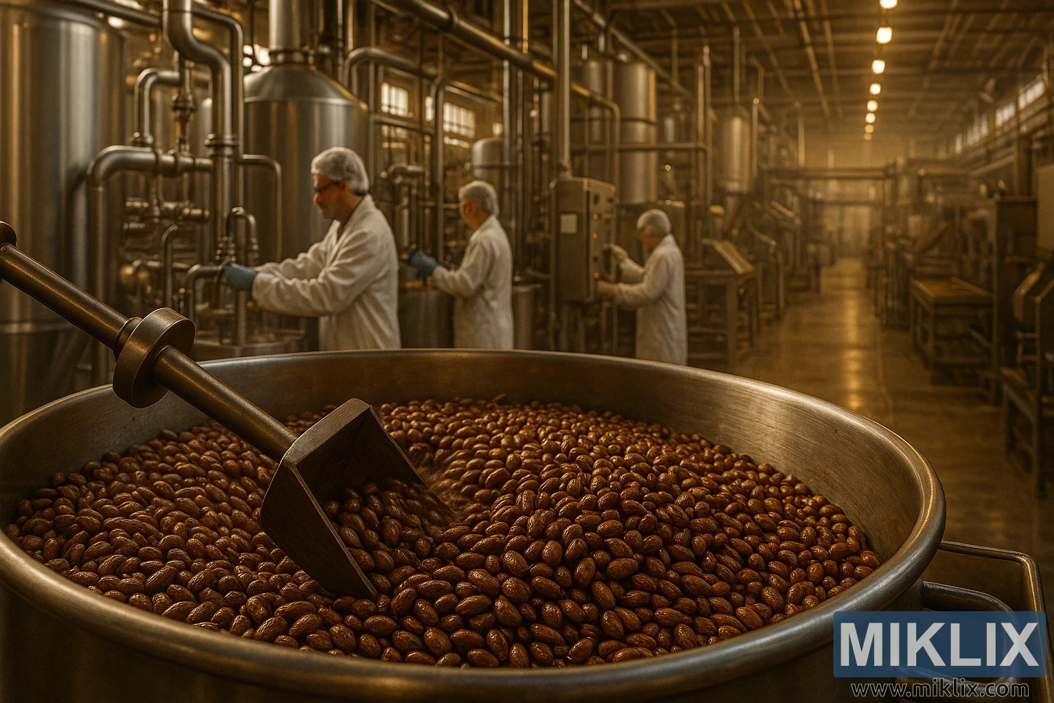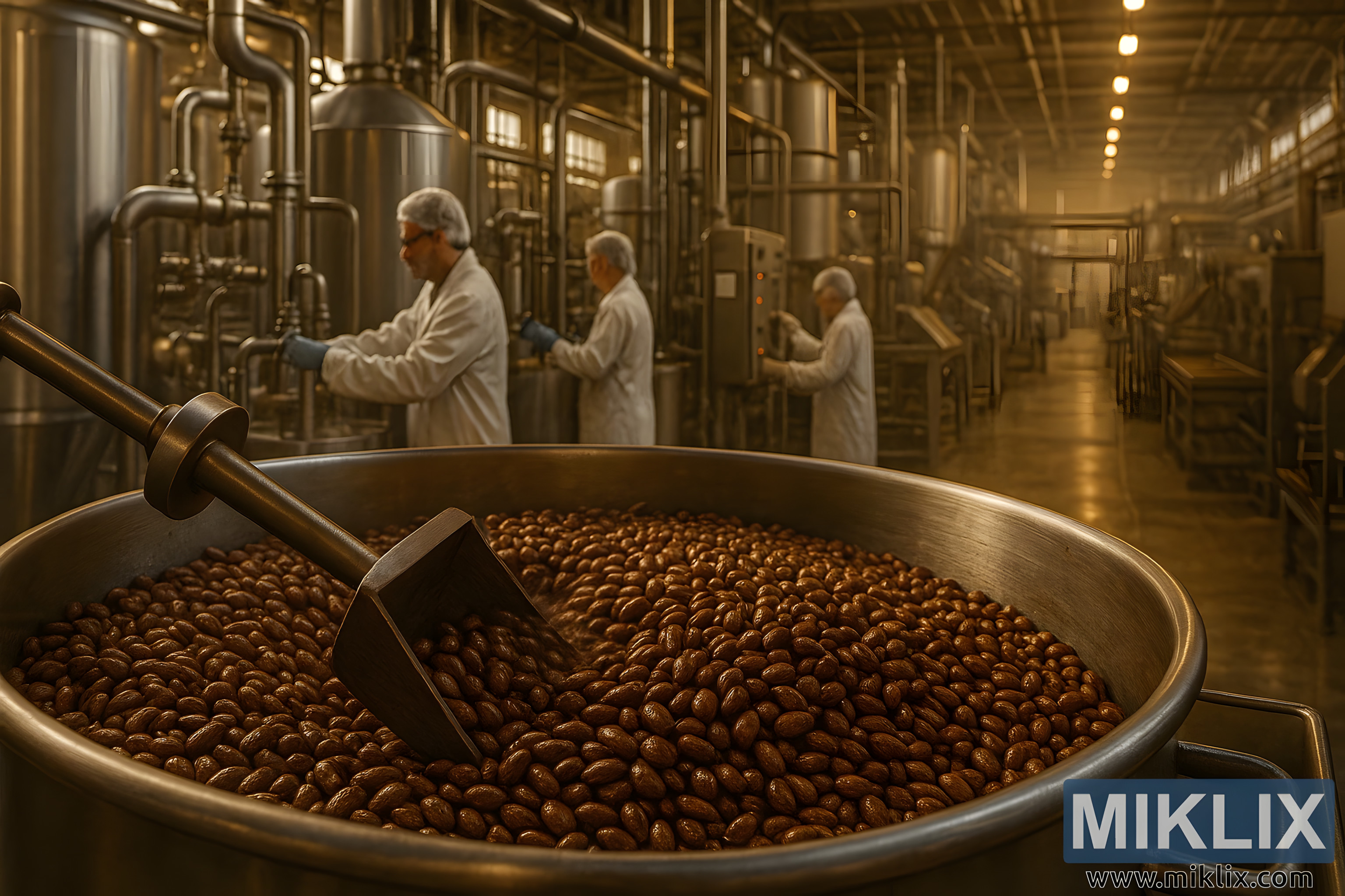 U srcu prostranog industrijskog pogona, slika bilježi trenutak dinamične preciznosti i senzornog bogatstva unutar proizvodne linije čokoladnog slada. Prostor je ogroman i pomno organiziran, njegove blistave površine od nehrđajućeg čelika odražavaju toplu, zlatnu rasvjetu koja cijelu scenu kupa u mekom, jantarnom sjaju. Ova rasvjeta, i funkcionalna i atmosferska, baca duge sjene po tvorničkom podu, ističući konture strojeva i kretanje radnika dok se kreću složenim krajolikom pivarske infrastrukture.