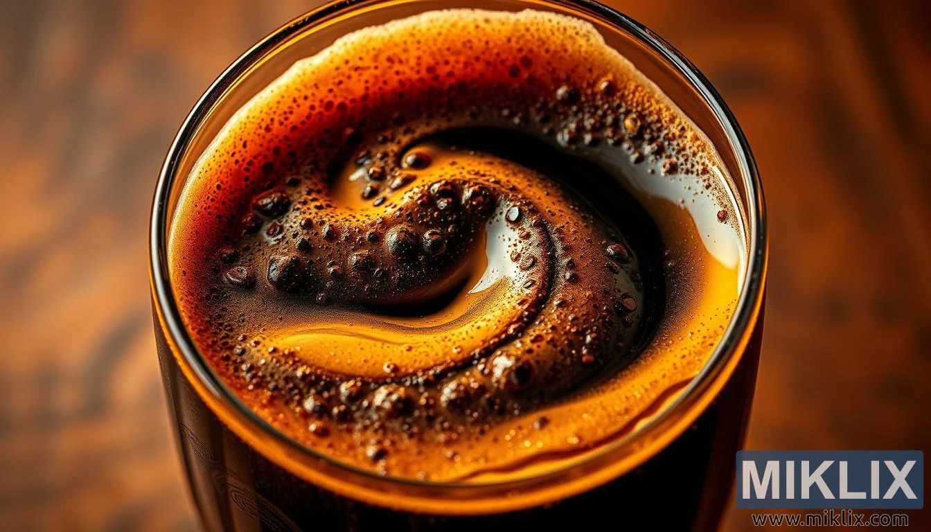 Bogato crno sladno pivo u kristalnoj čaši, koje svjetluca pod zlatnim svjetlom s notama pečenja, gorčine i karamele, pokazujući umjetnički um.