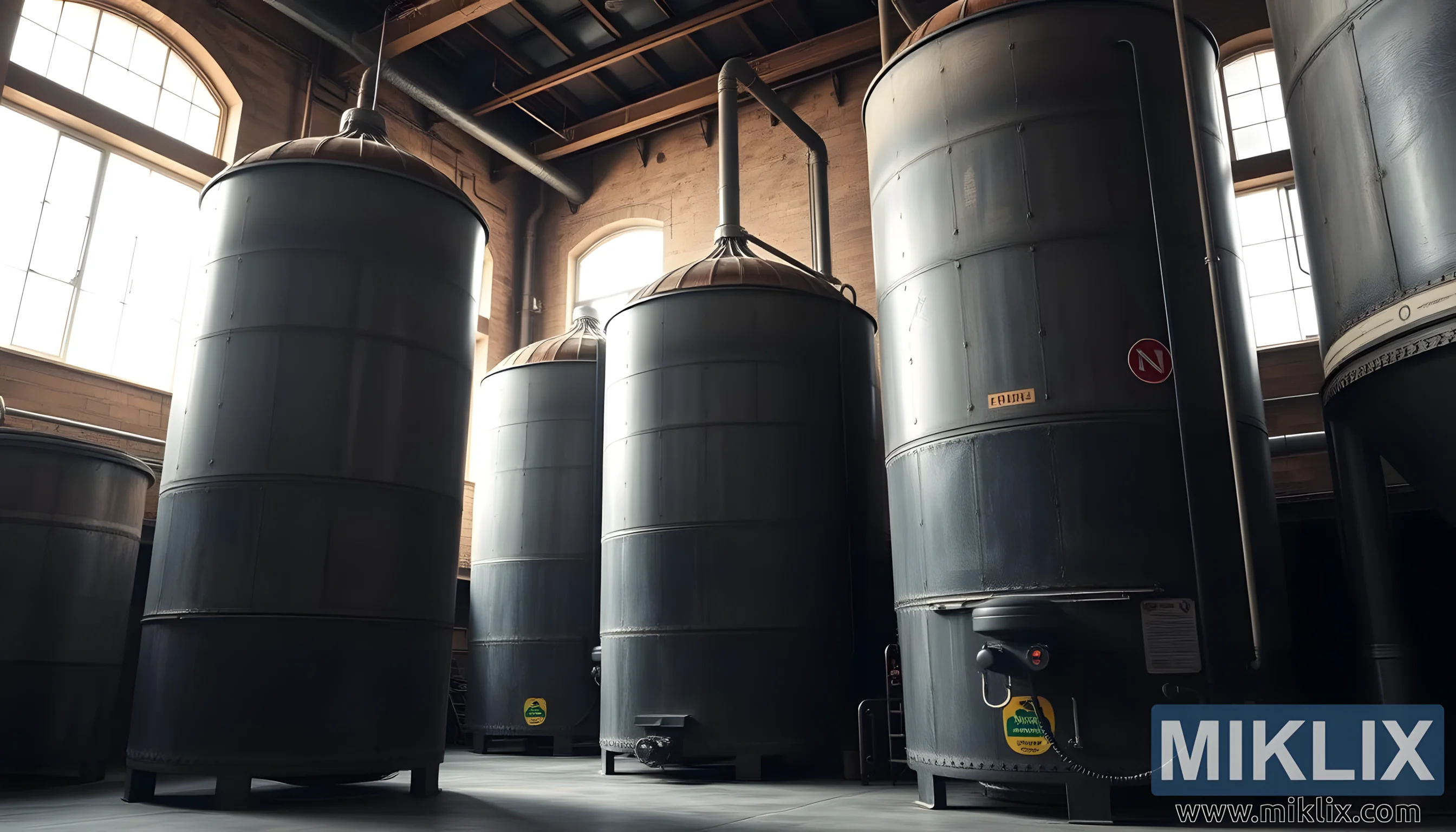 Scenom dominira nekoliko velikih, cilindričnih silosa za skladištenje slada, čiji se vertikalni oblici uzdižu poput stražara duž betonskog poda. Izrađeni od iznošenog metala, silosi nose tragove vremena i korištenja - zakovice, šavove i zakrpe koje govore o njihovoj izdržljivosti i bezbrojnim serijama slada koje su sadržavali. Njihove površine su matirane i blago išarane, upijajući svjetlost na nekim mjestima, a reflektirajući je na drugima, stvarajući dinamičnu vizualnu teksturu koja naglašava njihov industrijski karakter. Svaki silos opremljen je mrežom cijevi, ventila i mjerača, tvoreći složeni krvožilni sustav koji ih povezuje sa širim procesom proizvodnje piva. Ovi dodaci nisu samo funkcionalni; oni su simboli preciznosti i kontrole, bitni za održavanje integriteta slada koji se u njima skladišti.