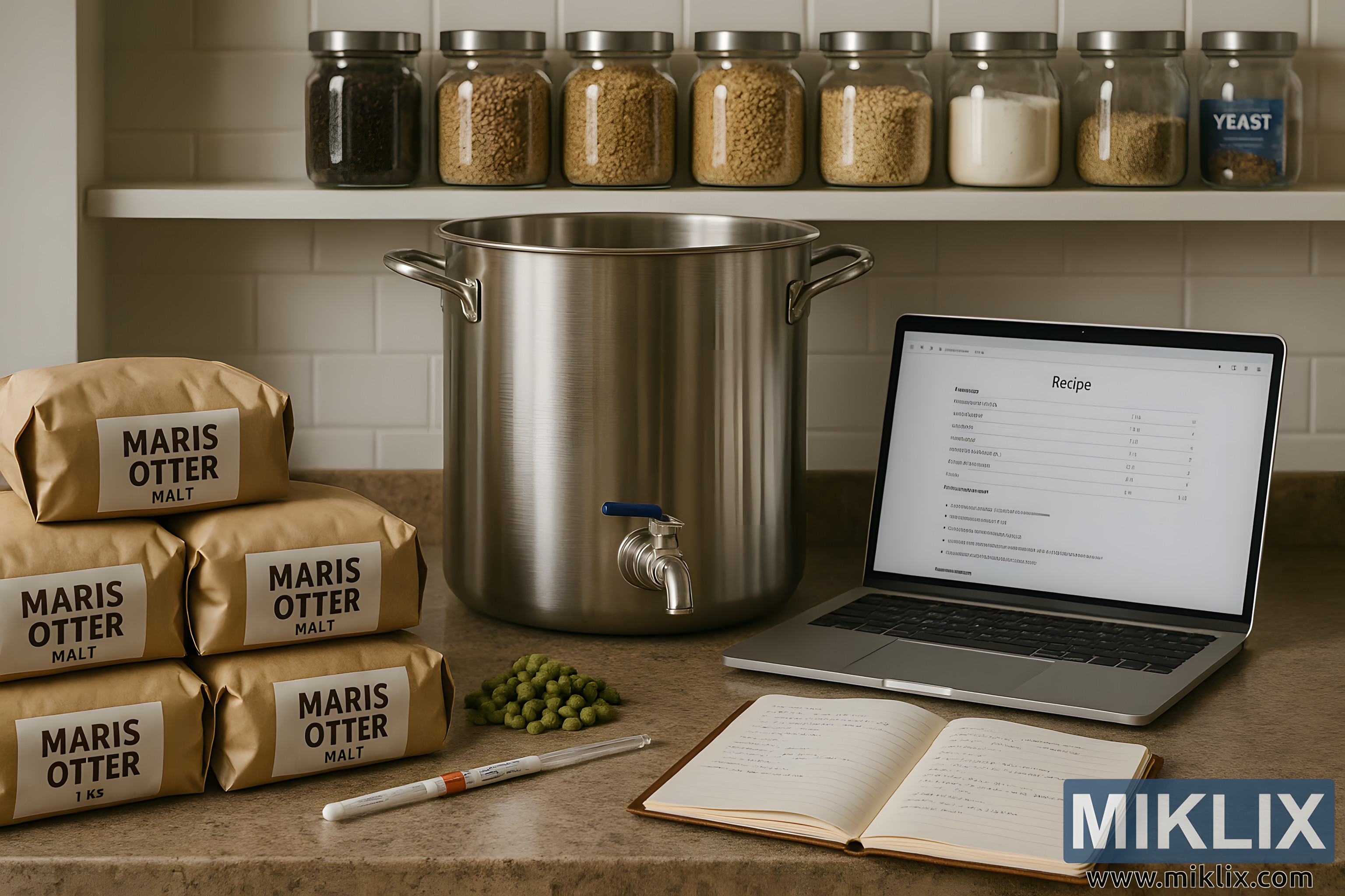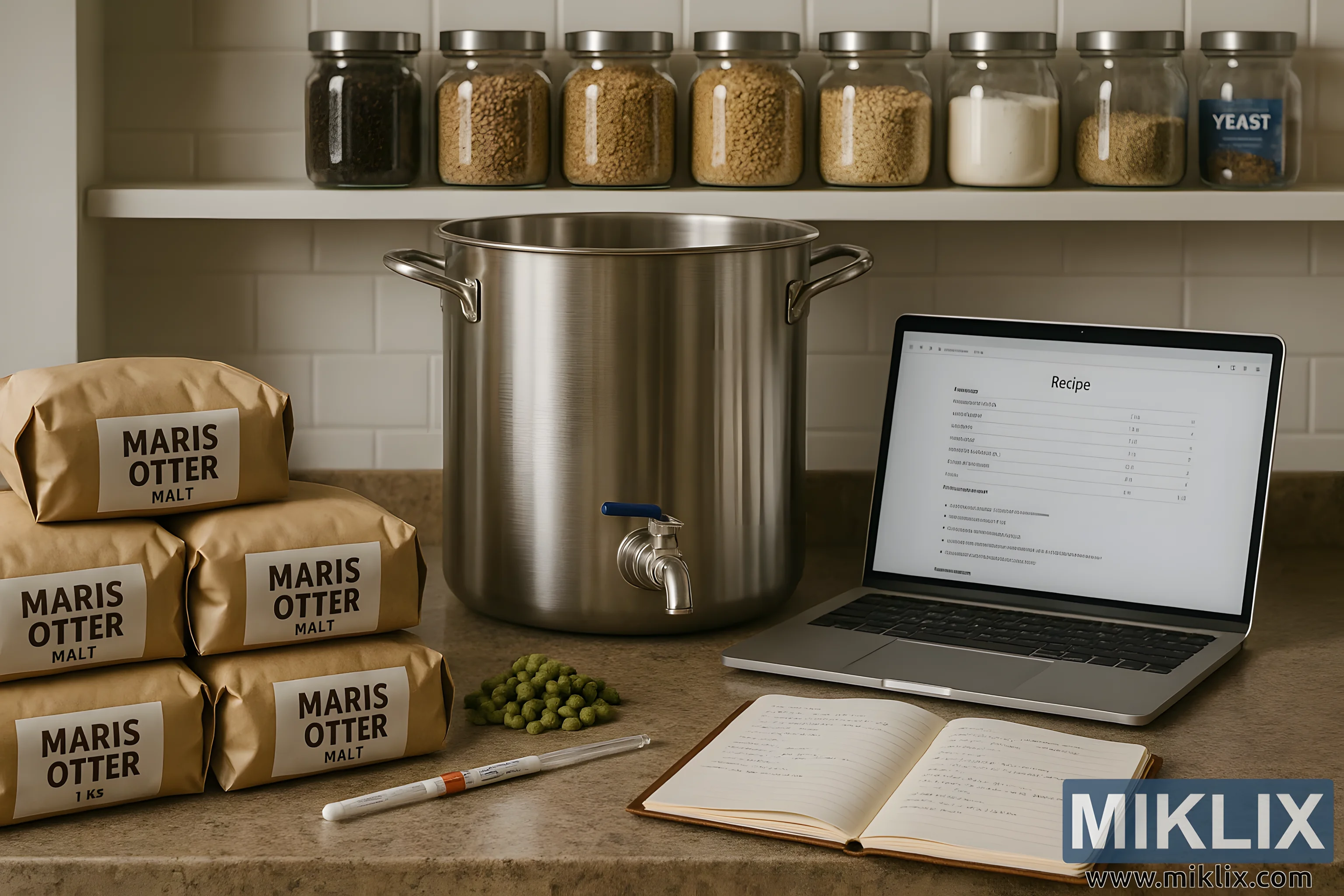 Kuhinjski pult s vrećicama slada Maris Otter, hmeljem, kotlom za kuhanje piva, prijenosnim računalom i bilješkama, stvarajući toplu scenu preciznosti i umijeća u razvoju recepata za pivo.
