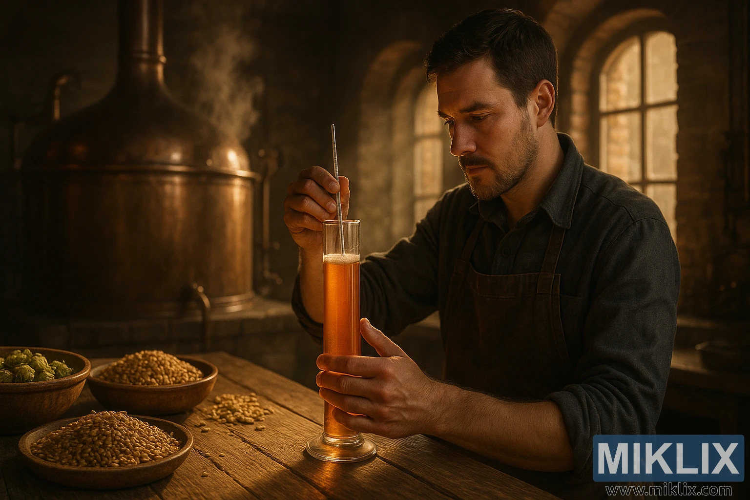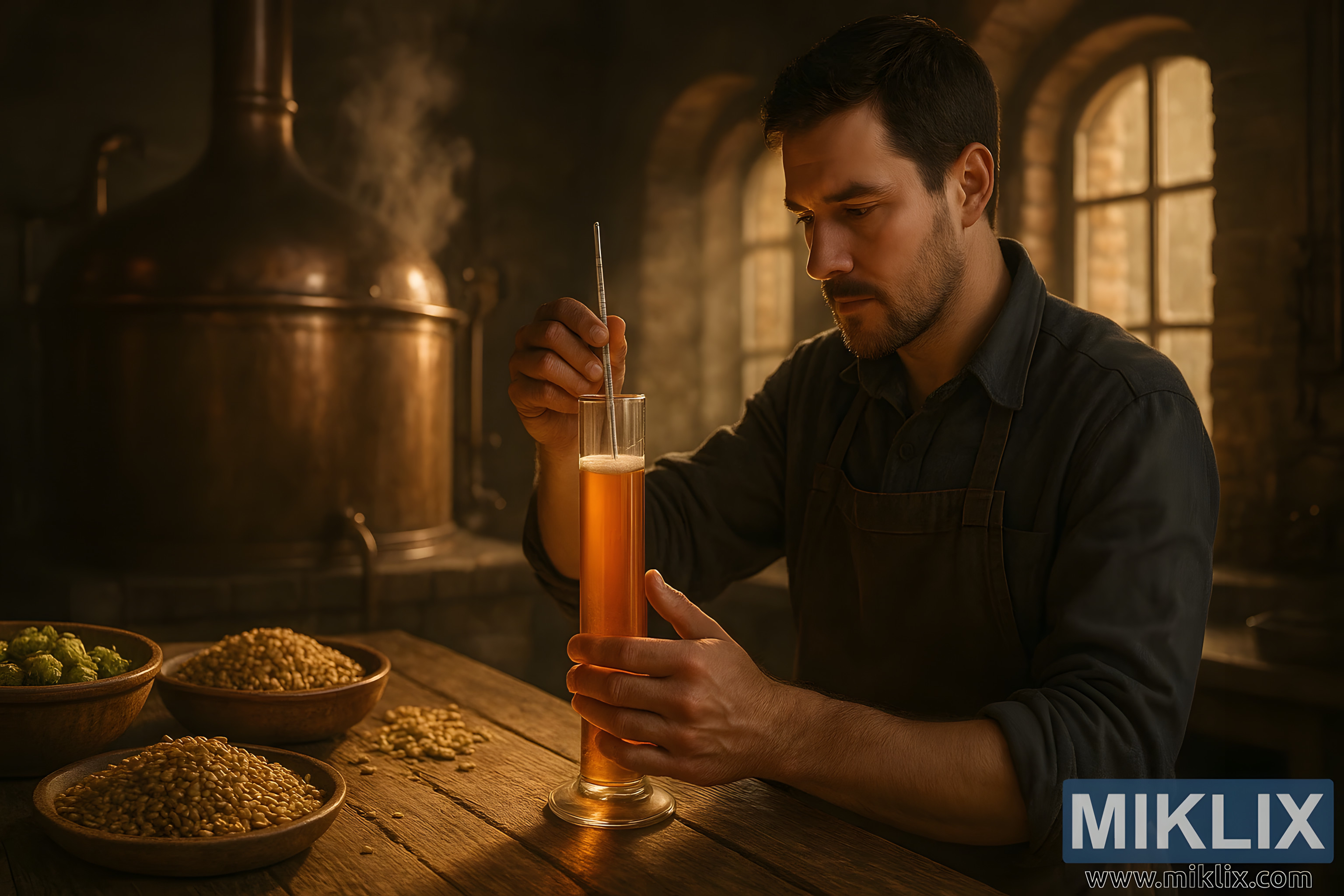 srcu tradicionalne pivovare, slika bilježi trenutak tihe koncentracije i zanatske preciznosti. Prostor je toplo osvijetljen, zlatno svjetlo prelijeva se preko bakrenih površina i starog drva, stvarajući atmosferu koja se čini bezvremenskom i intimnom. U središtu scene stoji pivar, odjeven u tamnu pregaču, usredotočenog i promišljenog držanja dok pažljivo spušta hidrometar u visoki graduirani cilindar napunjen sladovinom. Tekućina svijetli bogatom jantarnom nijansom, a površina lagano mjehuri, nagovještavajući šećere i proteine izvučene iz sladnog ječma. Pivarovo lice nježno je osvijetljeno obližnjim bakrenim kotlom, njegovi topli tonovi odražavaju sjaj okolnog svjetla i bacaju blagi oreol oko trenutka mjerenja.