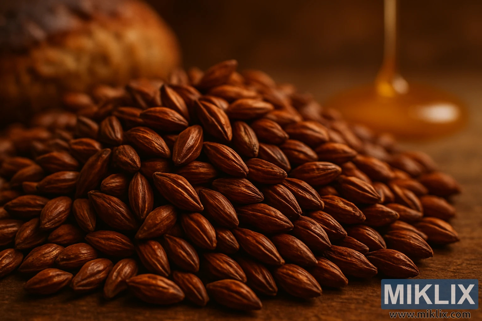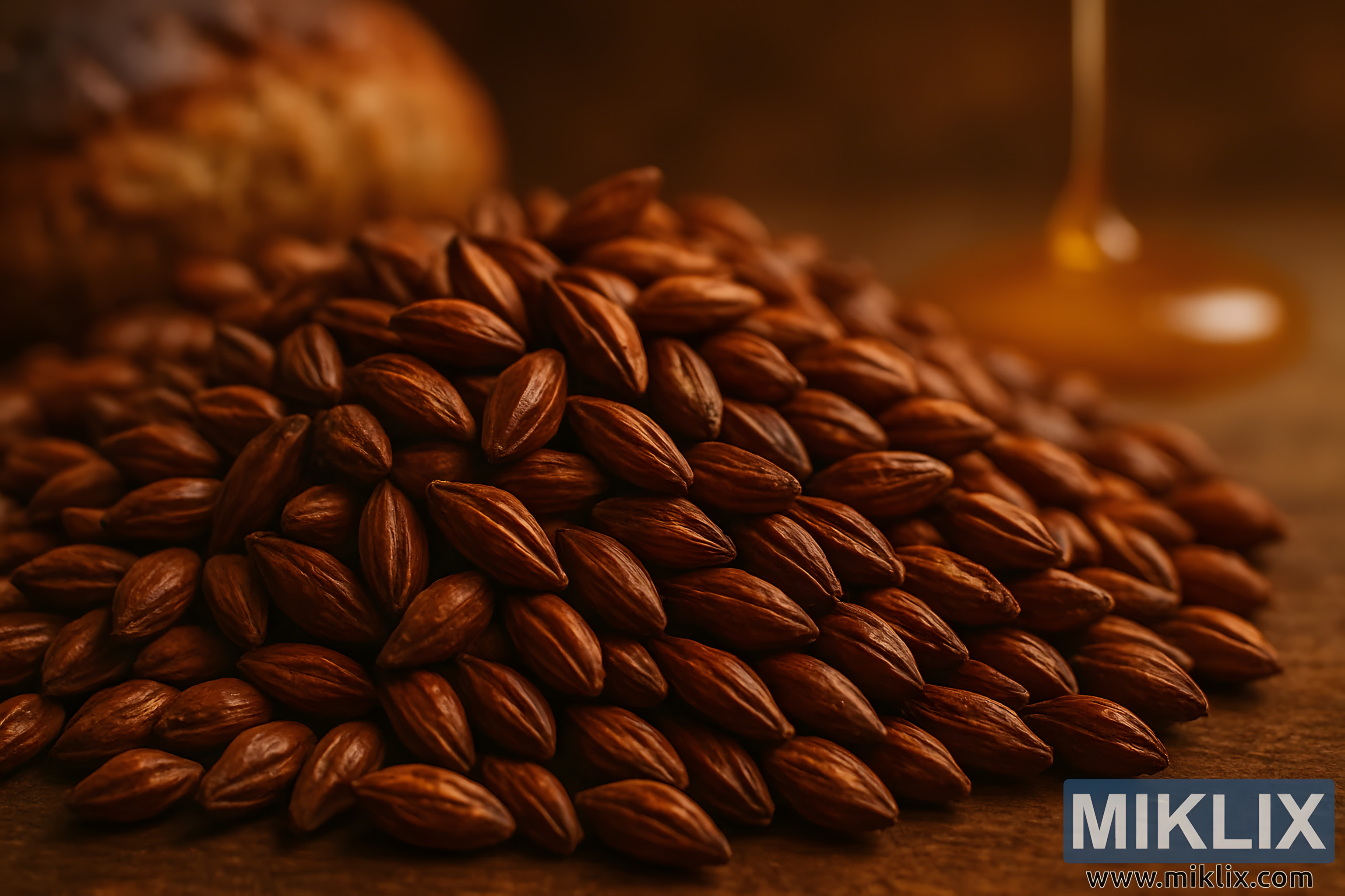 blago zamućenoj pozadini, slika nagovještava širi kulinarski kontekst slada. Kruh, zlatne i ispucale korice, nalazi se tik izvan fokusa, sugerirajući zajednički okusni teritorij između pečenih proizvoda i prženih žitarica. U blizini se izlijeva mlaz zlatnog meda, njegov viskozni tok hvata svjetlost i dodaje dašak slatkoće prizoru. Ovi elementi, iako sekundarni, pojačavaju okusni profil slada - intenzivno sladak, blago sladak i duboko zadovoljavajući. Također sugeriraju svestranost, nagovještavajući potencijal slada ne samo u pivarstvu već i u pečenju ili kulinarskom eksperimentiranju.