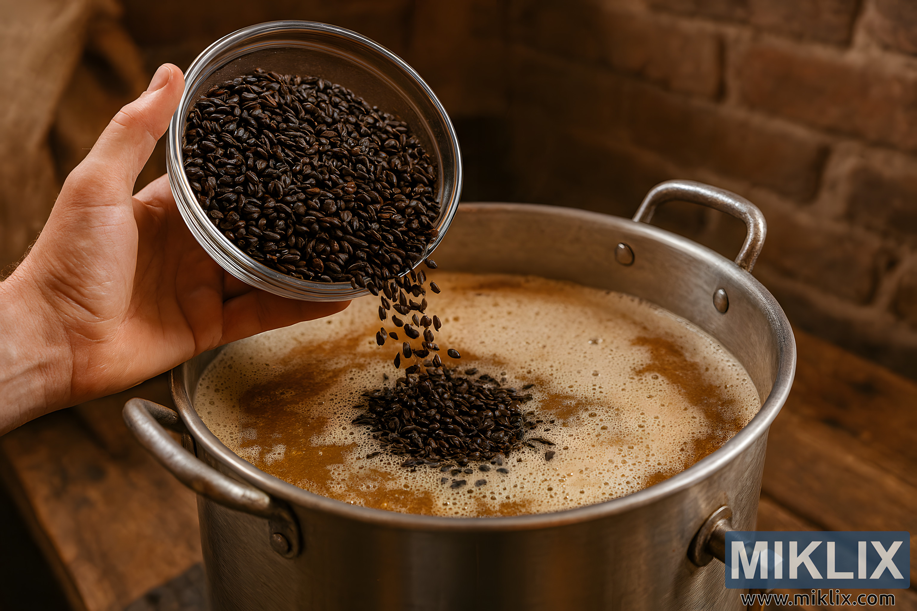 U prvom planu, ruka drži okruglu, prozirnu staklenu zdjelu napunjenu Midnight Wheat Maltom. Zrna slada su mala, duguljasta i duboko pržena, tamnosmeđe do gotovo crne nijanse s suptilnim površinskim naborima. Ruka, blago crvena od topline i napora, postavljena je tako da naginje zdjelu, omogućujući zrnima da se slijevaju u lonac. Pokret je zamrznut usred točenja, s mlazom zrna slada koji lebdi u zraku, stvarajući dinamičan luk koji vodi gledateljev pogled izravno u kašu.