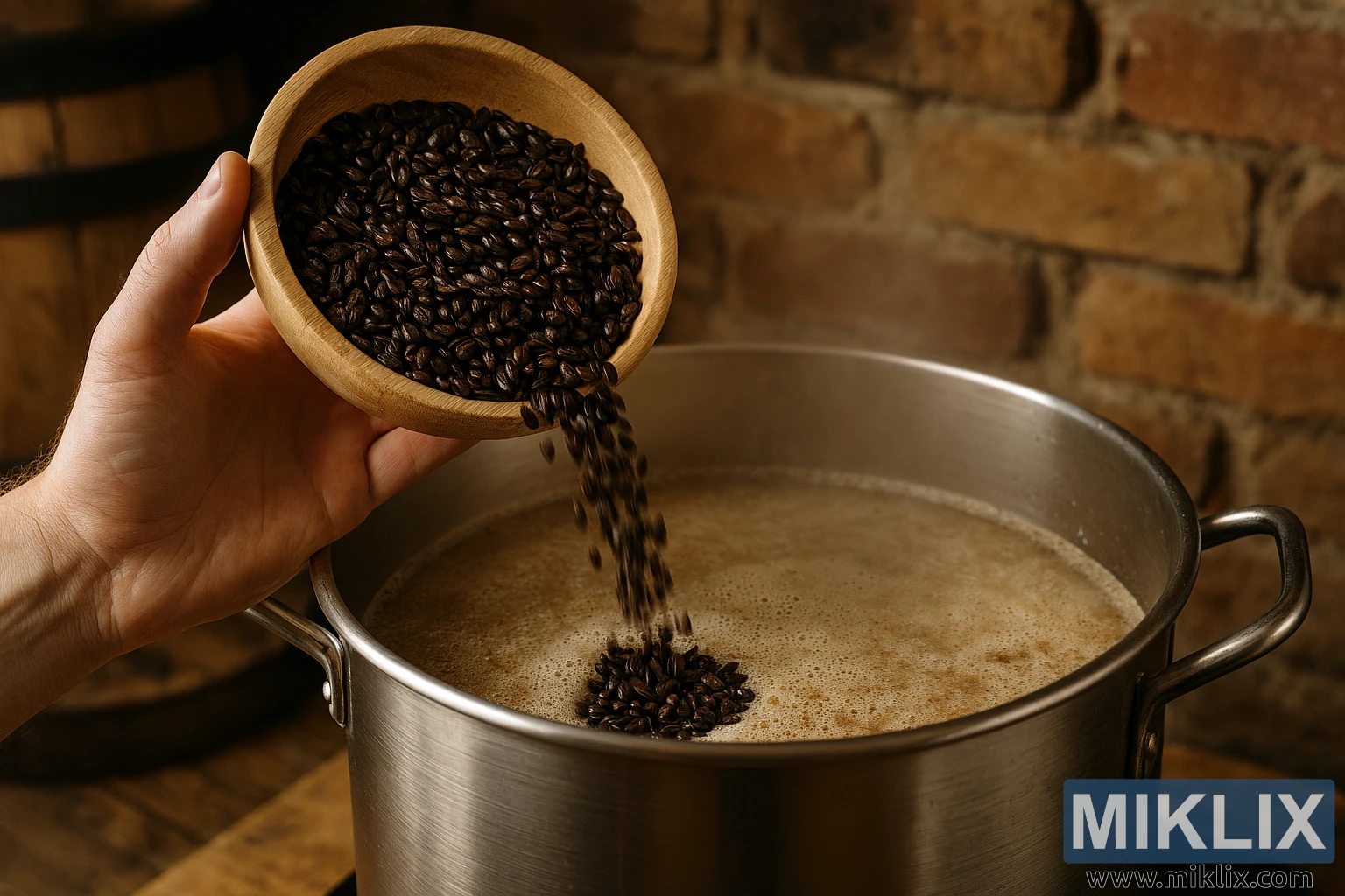 Slika: Dodavanje oljuštenog slada Carafa u rustikalni lonac za gnječenje