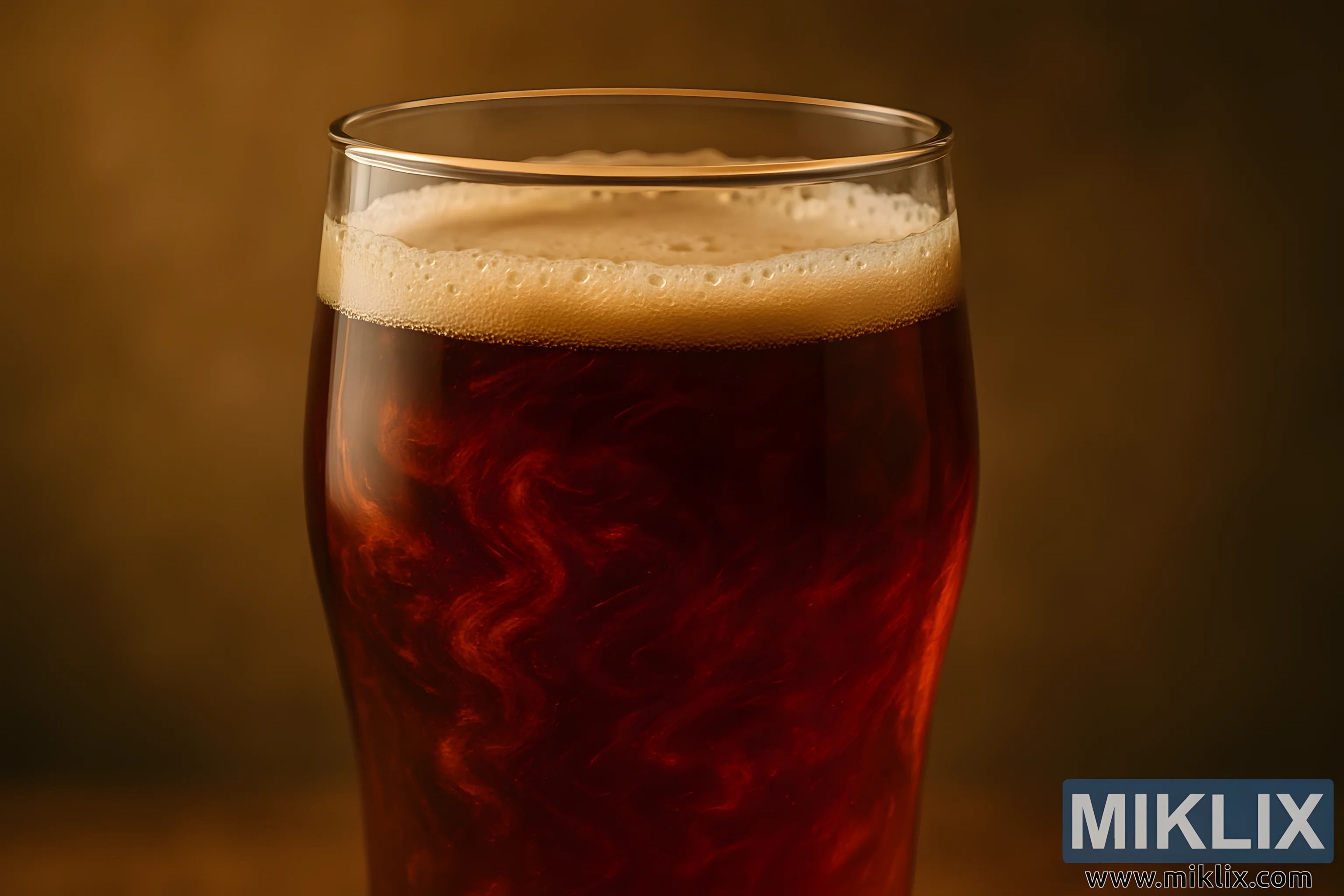 Okupana toplim, ambijentalnim svjetlom, slika bilježi trenutak tihog uživanja i senzornog bogatstva - krupni plan krigle napunjene tekućinom duboke jantarne boje, čija je površina živa od vrtložnog kretanja i suptilnih refleksija. Pivo, vjerojatno skuhano s velikodušnom dozom posebnog prženog slada, sjaji crvenkastosmeđim intenzitetom koji evocira toplinu, dubinu i složenost. Njegova boja podsjeća na polirani mahagoni ili osunčani javorov sirup, s odsjajem bakra i granata koji trepere kroz tekućinu dok hvata svjetlost. Pjenasta glava, kremasta i postojana, kruniše čašu mekom, jastučastom teksturom, prianjajući uz rub i polako se povlačeći u nježnim uzorcima koji nagovještavaju tijelo i karbonizaciju piva.