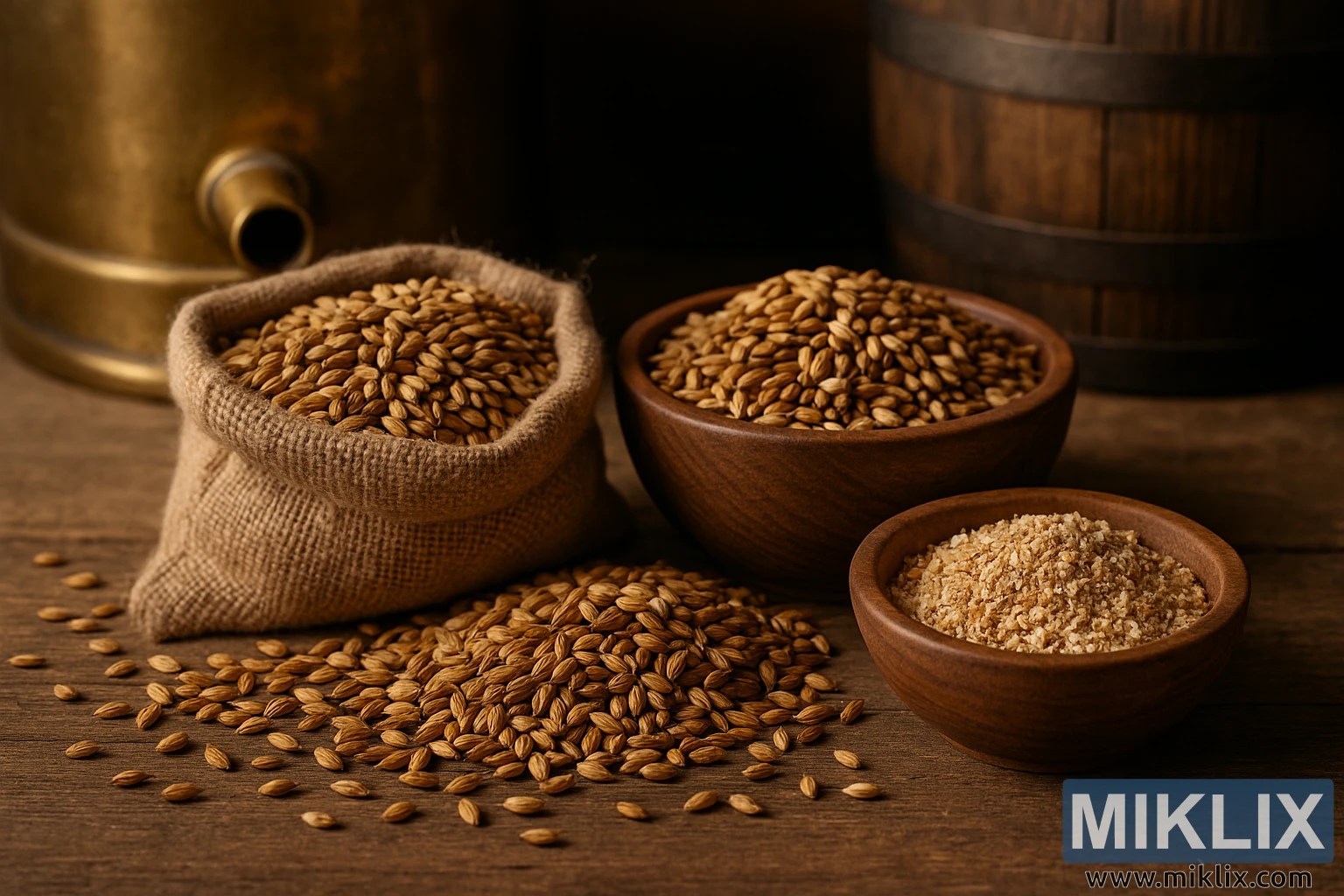 Rustikalna mrtva priroda sa sladnim ječmom, žitaricama, usitnjenim sladom, bakrenim kotlom i bačvom na drvu, koja evocira toplinu i tradiciju zanatskog kuhanja piva.