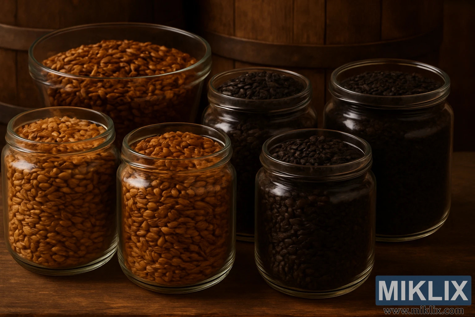 toplo osvijetljenom, rustikalnom okruženju koje dočarava tihi šarm tradicionalne pivovare, slika predstavlja pažljivo odabrani prikaz specijalnih sladova, svaki smješten u vlastitu prozirnu staklenu posudu. Staklenke su raspoređene u dva simetrična reda na drvenoj površini, a njihov sadržaj otkriva bogat spektar prženih zrna koja se kreću od zlatno jantarne do tamno čokoladno smeđe boje. Ovaj vizualni gradijent je više od estetske prirode - on priča priču o razvoju okusa, o nijansiranim tehnikama prženja koje pretvaraju sirovi ječam u okosnicu kompleksnih piva s naglaskom na slad.