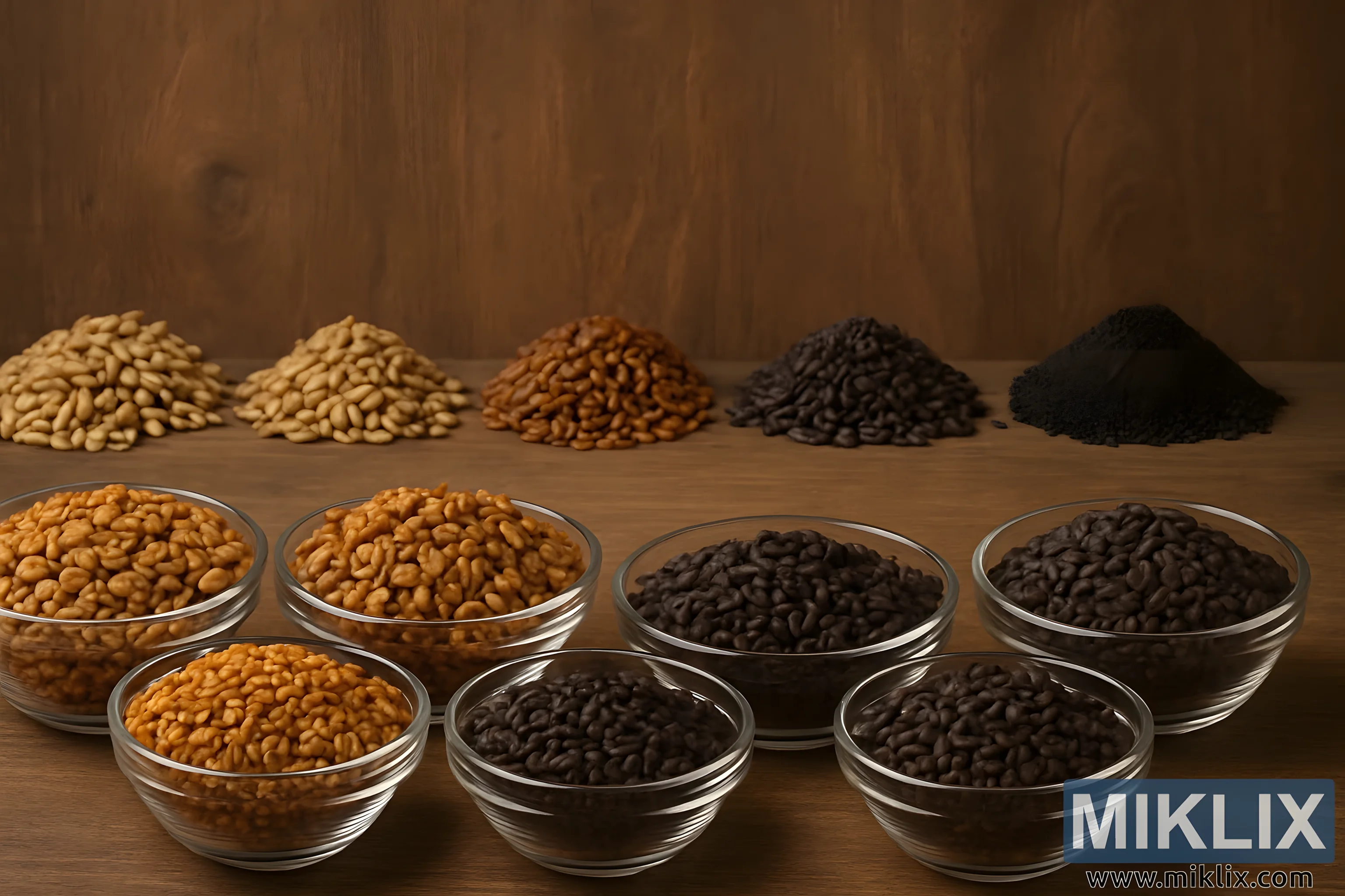 Odmah iza zdjelica, odgovarajuće hrpe zrna cijelog slada postavljene su izravno na drvenu površinu, odražavajući sadržaj zdjelica i dodajući taktilnu dimenziju kompoziciji. Ove hrpe su raspoređene u gradijentu, prelazeći od svijetlog prema tamnom, a njihov raspored poziva oko da putuje preko slike, prateći transformaciju koja se događa dok se ječam prži u različitim stupnjevima. Svjetliji sladovi, sa svojim zlatnim i mednim tonovima, sugeriraju slatkoću i suptilnost - idealno za dodavanje tijela i nježnih karamelnih nota svjetlijim aleovima. Kako se boje produbljuju, sladovi poprimaju bogatije, tostiranije karakteristike, s naznakama karamele, korice kruha i suhog voća. Najtamnija zrna, gotovo crna i sjajna, evociraju smjele okuse espressa, kakaa i ugljena - savršeno za stoute, portere i druge robusne stilove piva.