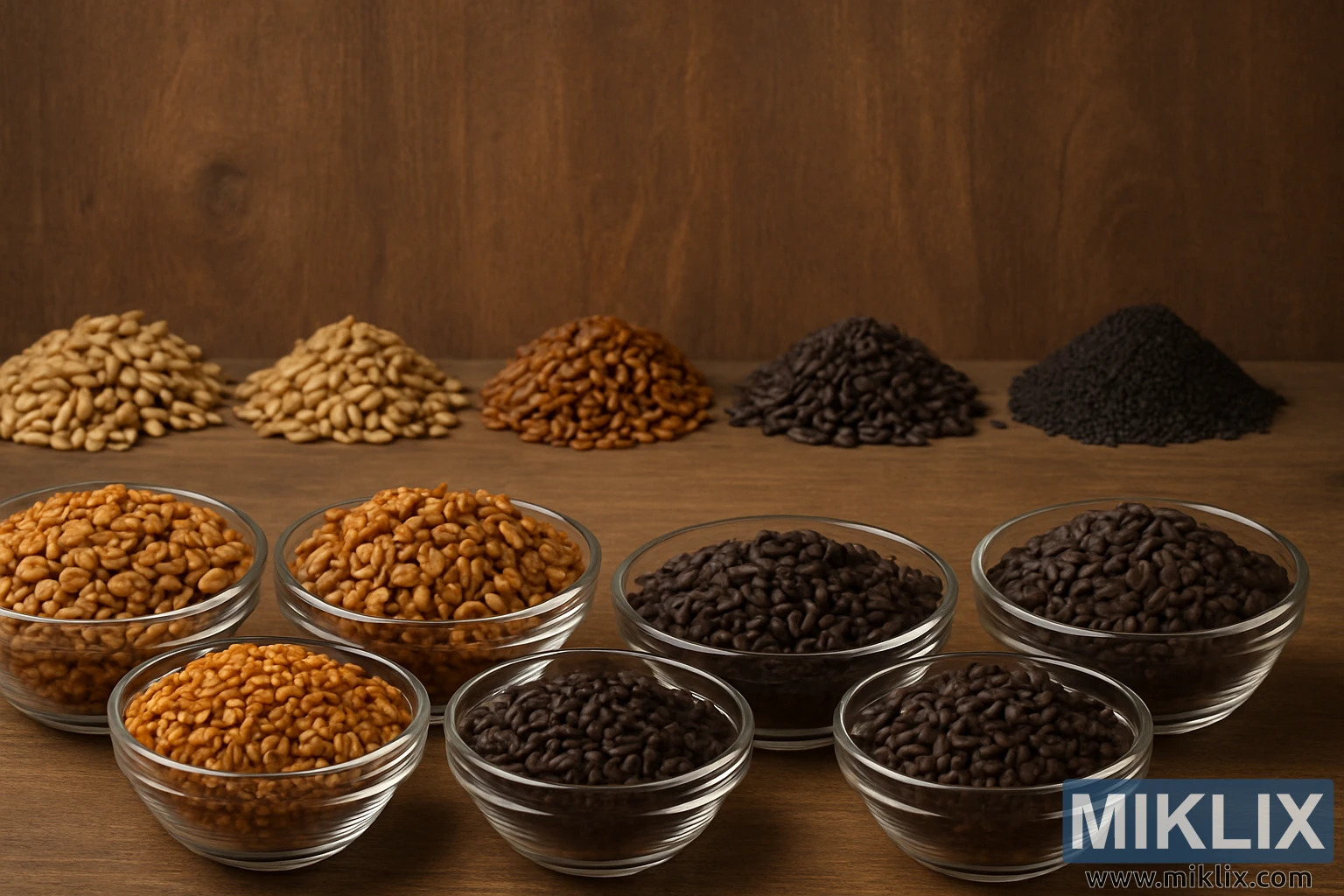 Uredno aranžiran prikaz karamelnog, kristalnog, prženog i čokoladnog slada u staklenim zdjelama, ističući boju, teksturu i raznolikost pivarstva.