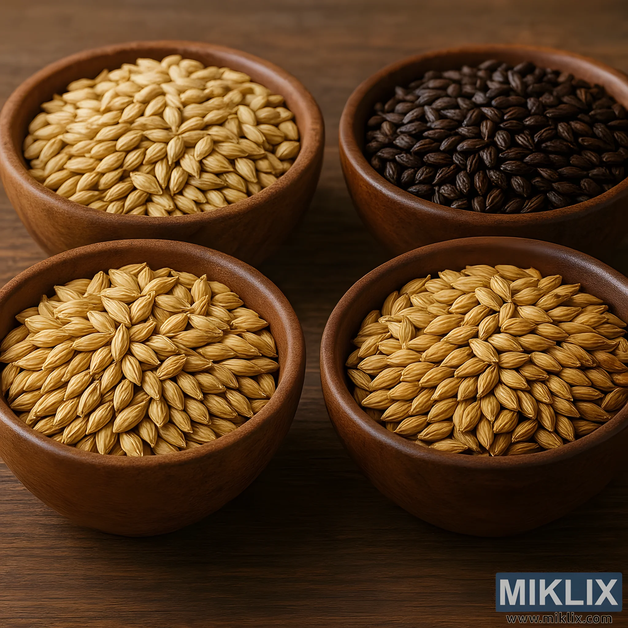 Na bogato zrnastoj drvenoj površini koja odiše toplinom i zanatskim šarmom, četiri drvene zdjele postavljene su u kvadratnoj formaciji, a svaka je prepuna različite vrste ječmenog slada koji se koristi u kućnom pivarstvu. Aranžman je vizualno ugodan i edukativan, nudeći taktilni uvid u nijansirani svijet sladnih žitarica. Ovi sladovi, okosnica tijela i okusa piva, predstavljeni su na način koji ističe njihovu raznolikost - ne samo u boji, već i u teksturi, stupnju prženja i potencijalu pivarstva. Rustikalno drvo ispod zdjela dodaje dubinu i autentičnost sceni, utemeljujući gledatelja u tradiciji koja seže stoljećima unatrag.