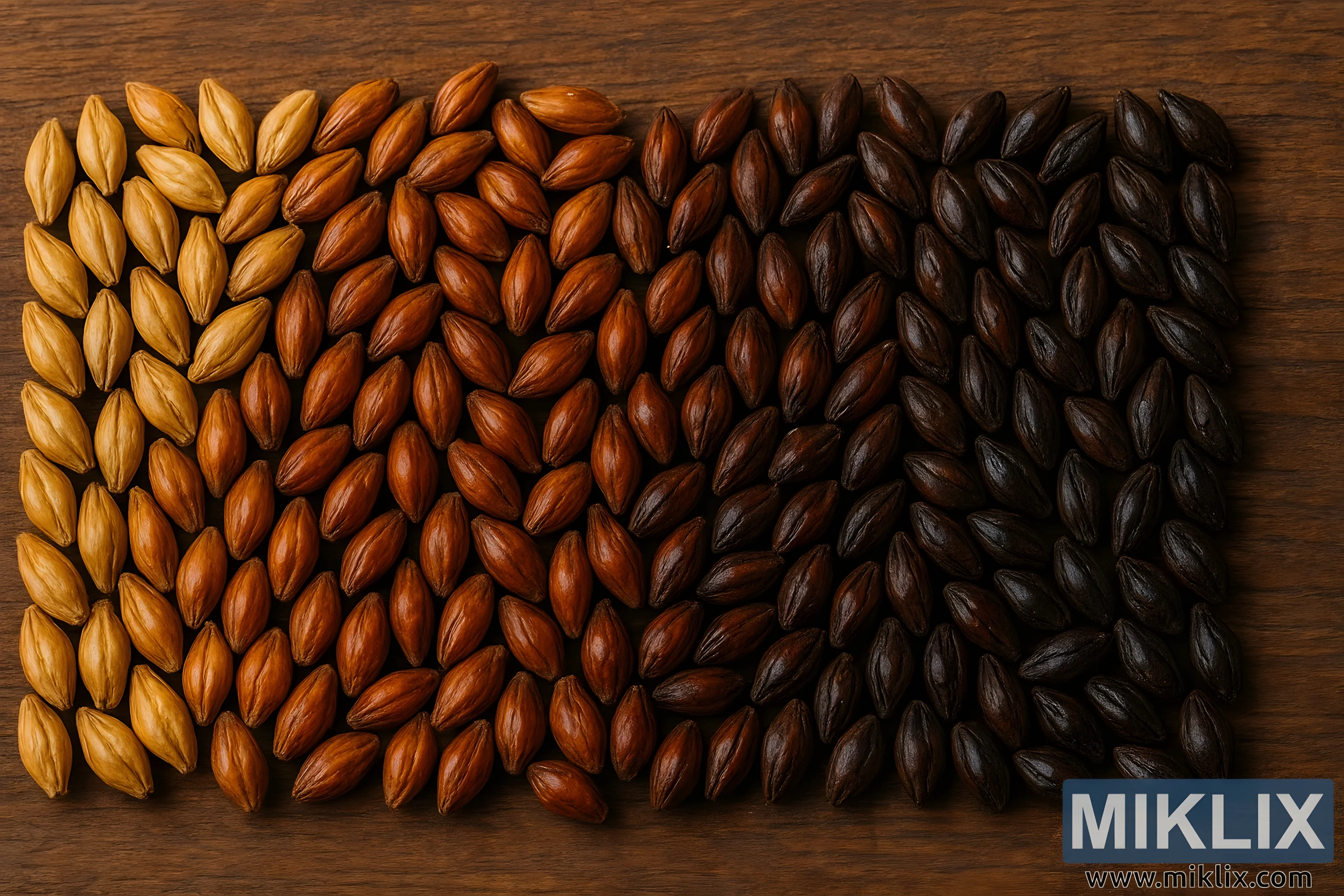 Raširena po bogato teksturiranoj drvenoj površini, ova slika obuhvaća nijansiranu ljepotu specijalnih sladova koji se koriste u domaćem pivu, raspoređenih u namjernom i vizualno uvjerljivom gradijentu. Sladovi su raspoređeni u četiri različita horizontalna reda, od kojih svaki predstavlja različitu fazu karamelizacije i prženja, napredujući od najsvjetlijih zlatnih nijansi s lijeve strane do najdubljih, gotovo crnih tonova s desne strane. Ovaj gradijent ne služi samo kao vizualna gozba, već i kao taktilni prikaz spektra okusa dostupnog pivarima, prikazujući transformaciju ječma kroz toplinu i vrijeme.