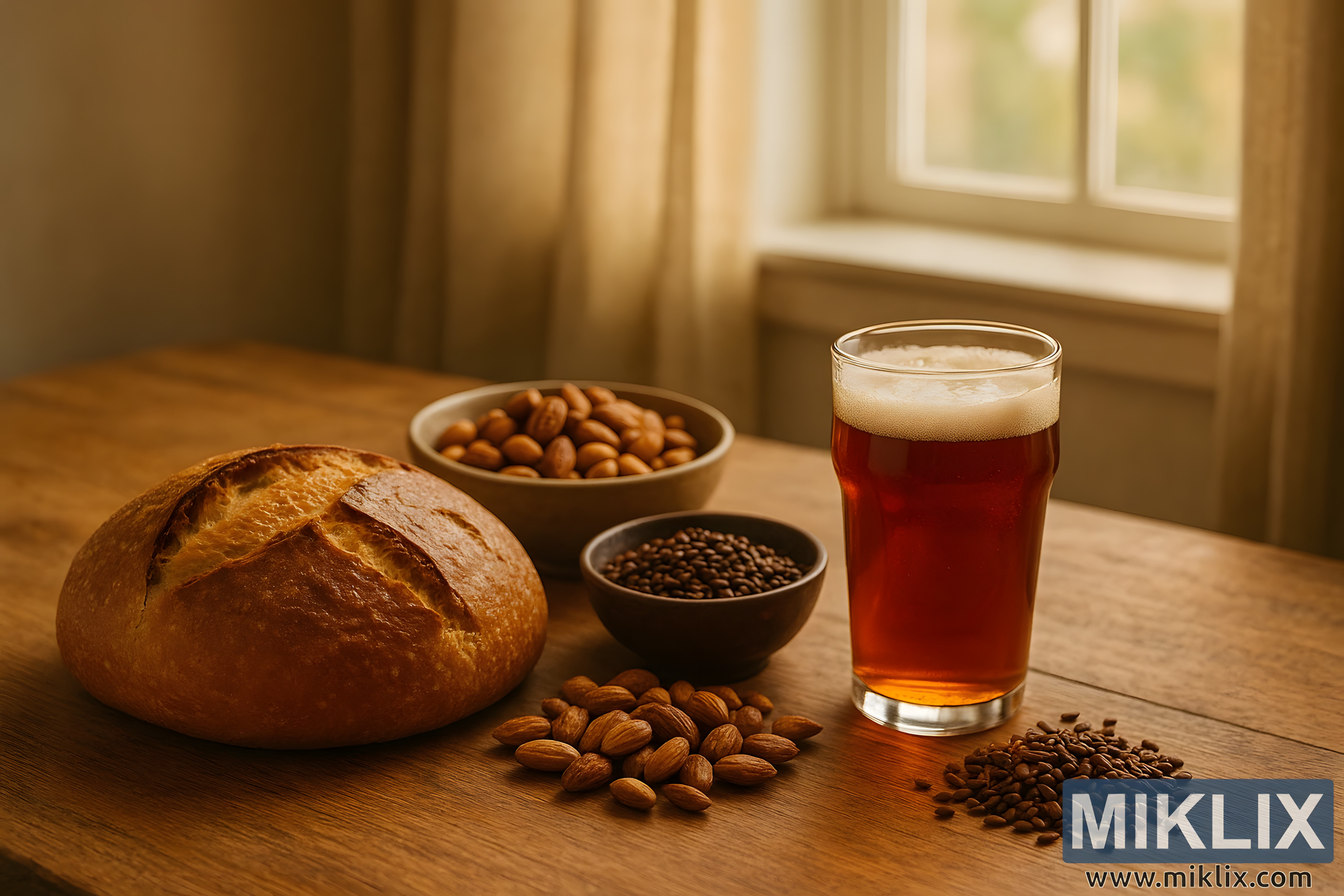 Ugodna kuhinjska scena s kruhom Victory Malt, jantarnim pivom, tostiranim orašastim plodovima i zrnima slada, okupana mekim prirodnim svjetlom za topao, domaći osjećaj.