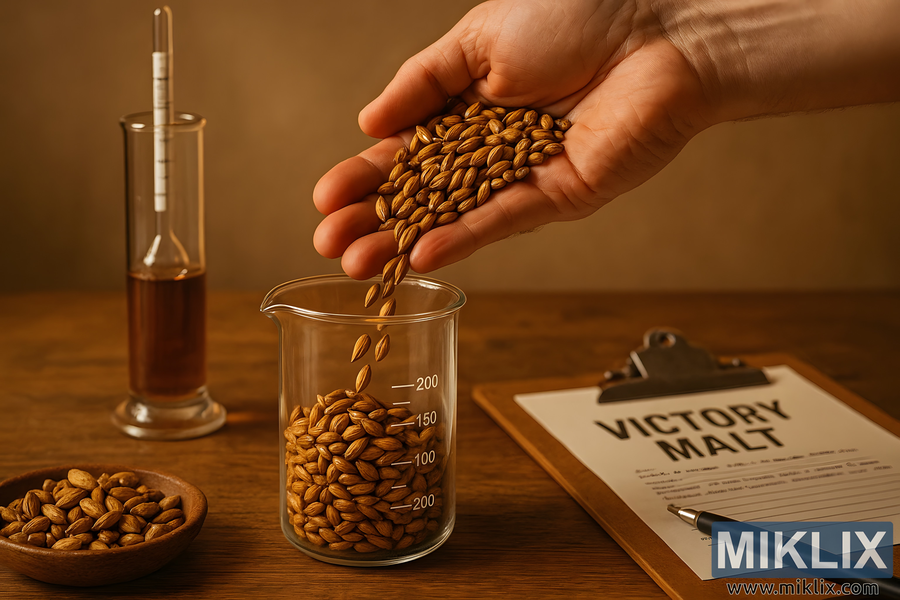 Na desnoj strani okvira, na stolu leži ploča s natpisom "VICTORY MALT" podebljanim slovima. Pored nje leži olovka, spremna za bilješke, što sugerira da je ovo trenutak dokumentiranja koliko i stvaranja. Prisutnost pisanih bilješki implicira metodičan pristup - možda pivar koji usavršava novi recept, prilagođava omjere slada ili bilježi senzorna zapažanja. Ova mješavina taktilnog angažmana i intelektualne strogosti naglašava dvostruku prirodu kuhanja piva: intuitivnu i empirijsku, ekspresivnu i preciznu.
