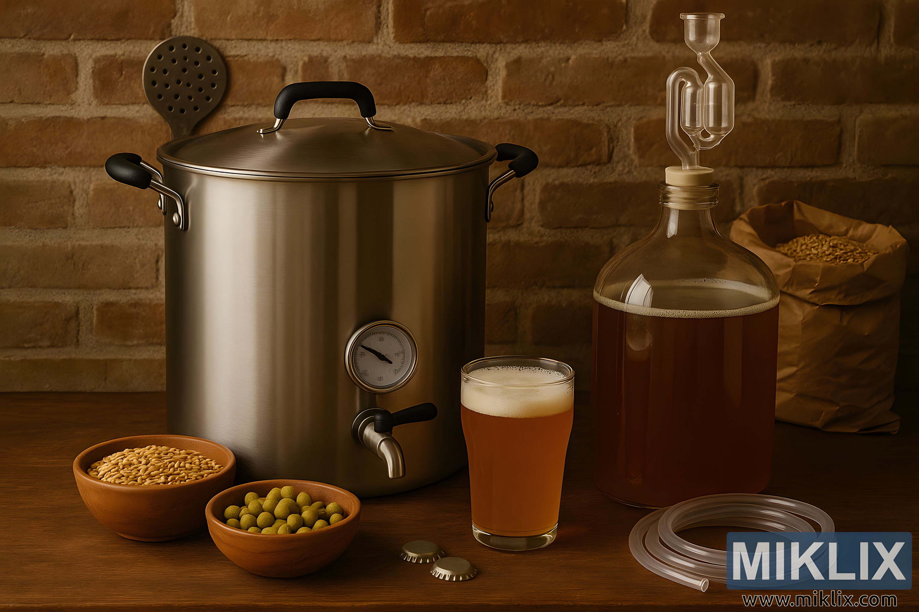 ovoj evokativnoj sceni, rustikalni, ali privlačan kućni pivarski namještaj pažljivo je postavljen uz pozadinu teksturiranog zida od opeke, stvarajući atmosferu koja djeluje bezvremenski i osobno. U središtu kompozicije stoji veliki kotao za kuhanje piva od nehrđajućeg čelika, čija brušena metalna površina nježno reflektira toplo, ambijentalno svjetlo prostorije. Kotao je opremljen ugrađenim termometrom, praktičnim detaljem koji ne samo da signalizira pivarovu pažnju prema preciznosti, već i prenosi procesnu prirodu stvaranja piva od nule. Čvrsta slavina u podnožju dodatno naglašava njegovu funkcionalnost, podsjetnik na trenutke kada će se vruća sladovina točiti i prelijevati u posude koje čekaju. U blizini, na glatkoj drvenoj površini, polirana kutlača nagovještava miješanje, miješanje i strpljivu njegu potrebnu tijekom cijelog ciklusa kuhanja.